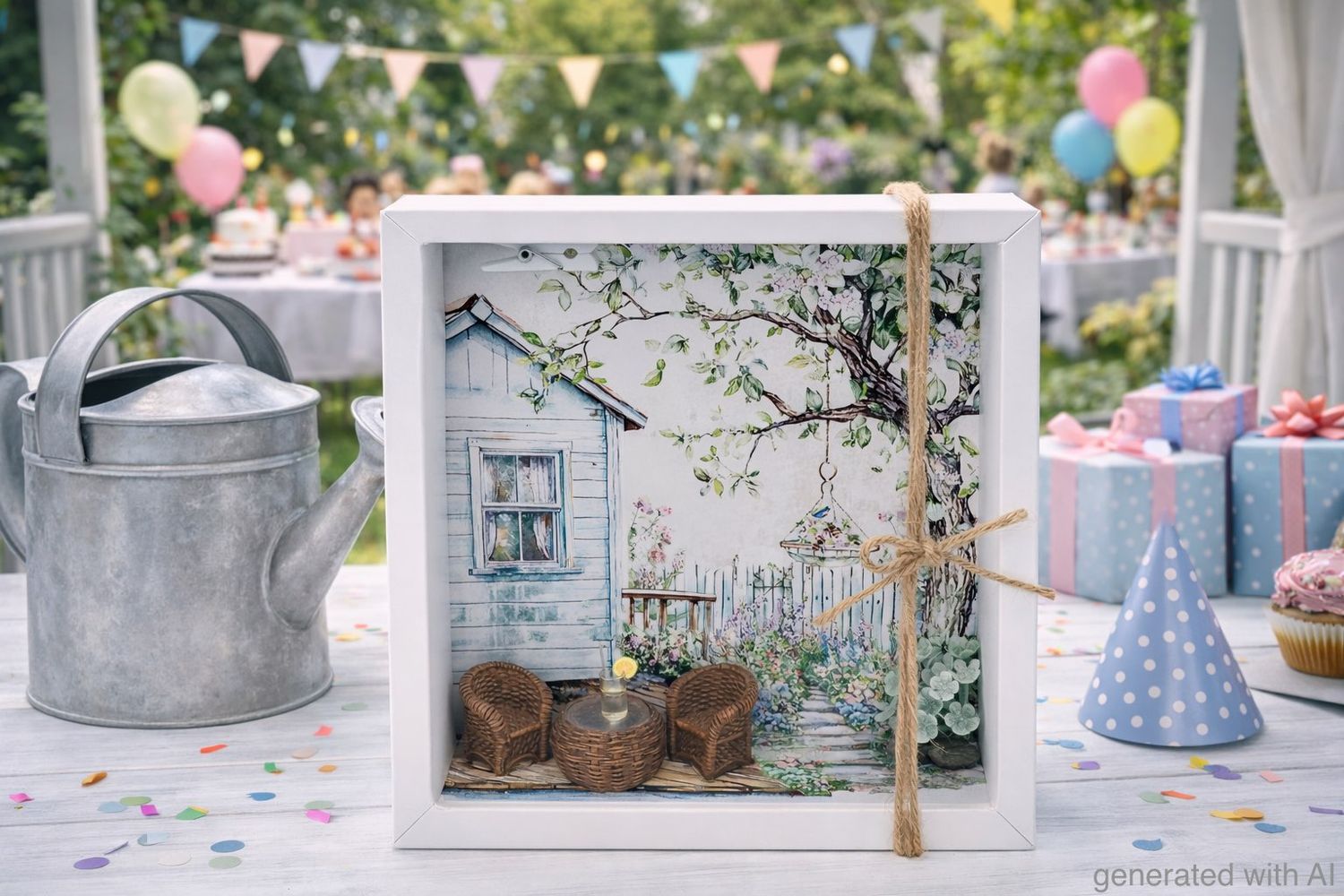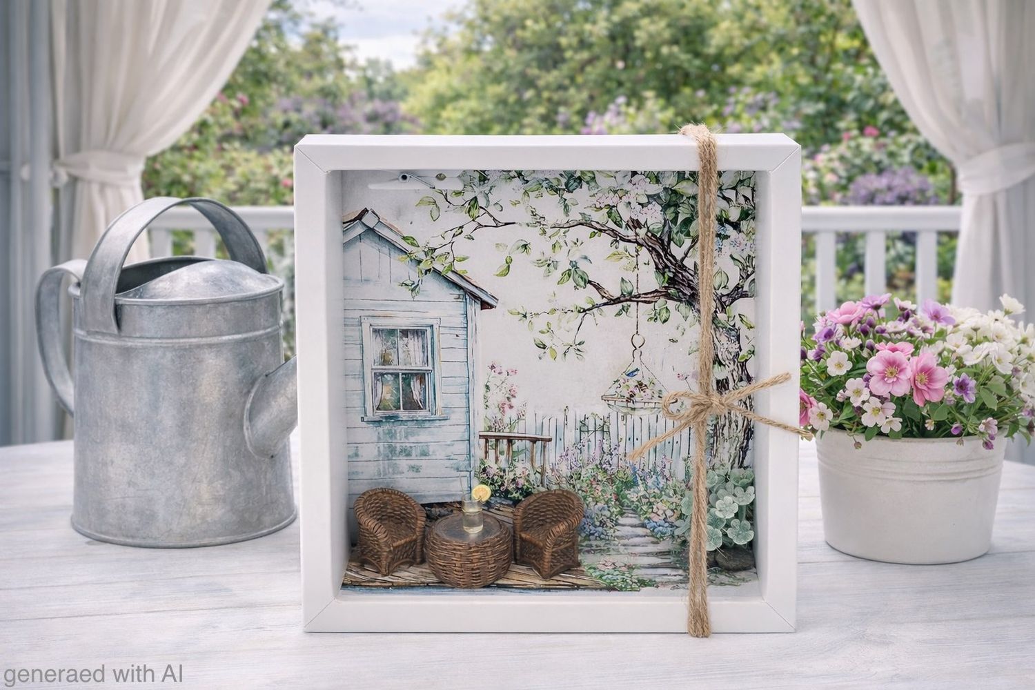 Inhalt: Ein auf Papier gedruckter Hintergrund mit einem Häuschen mit Garten und Terrasse, wo Gartenmöbel und ein Getränk platziert sind.