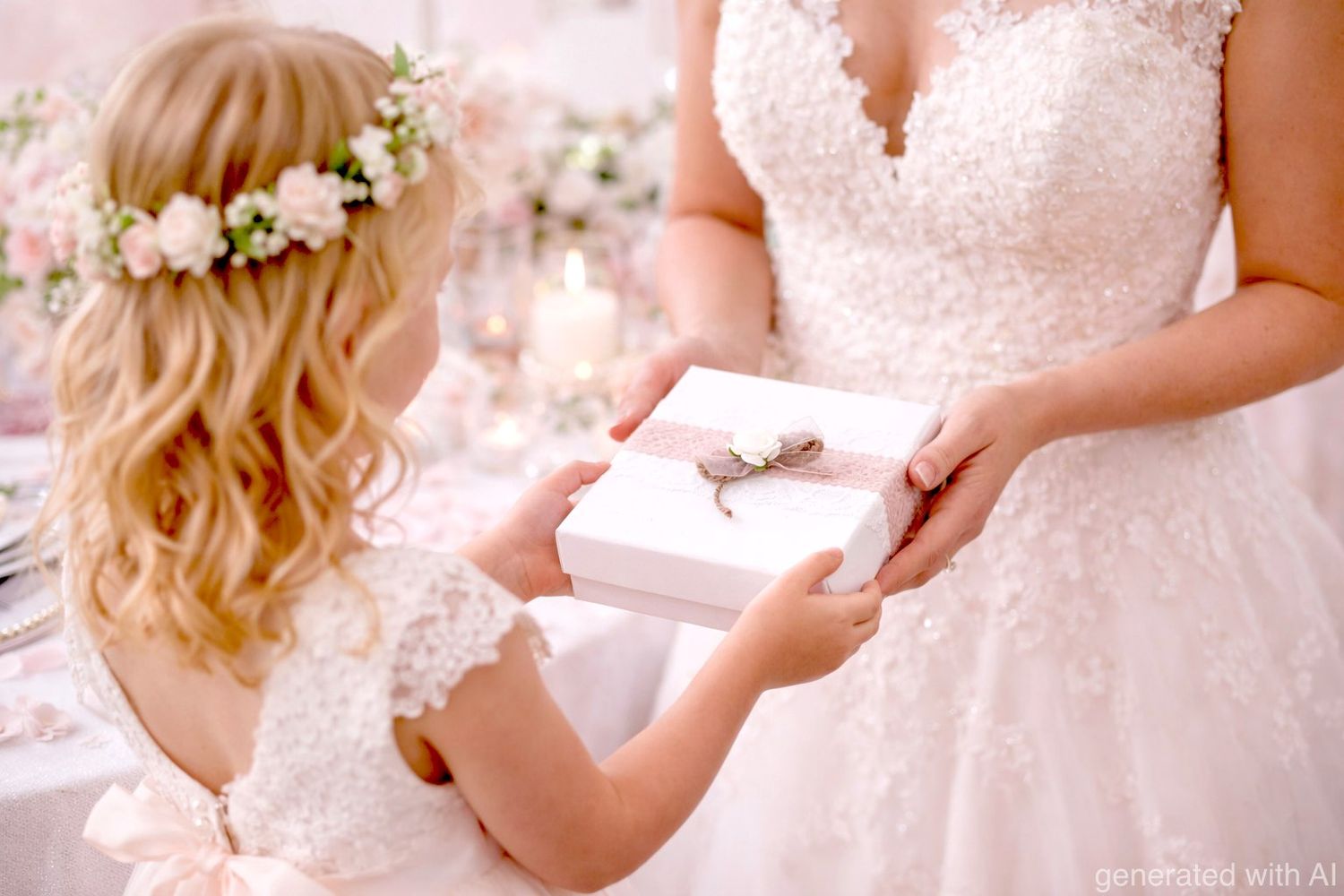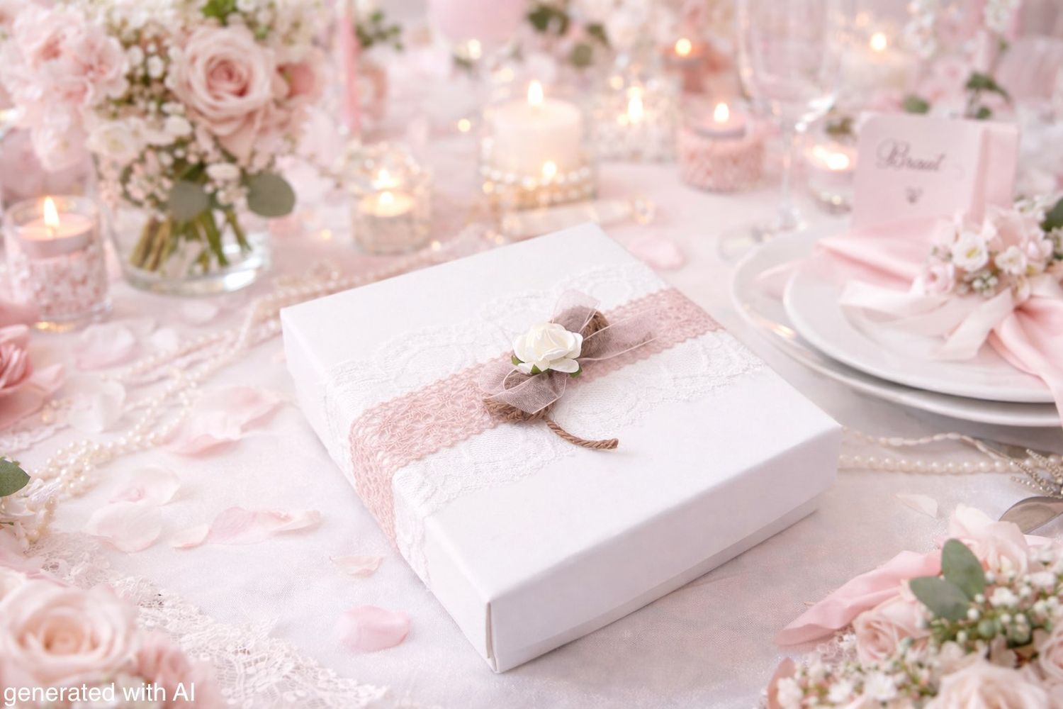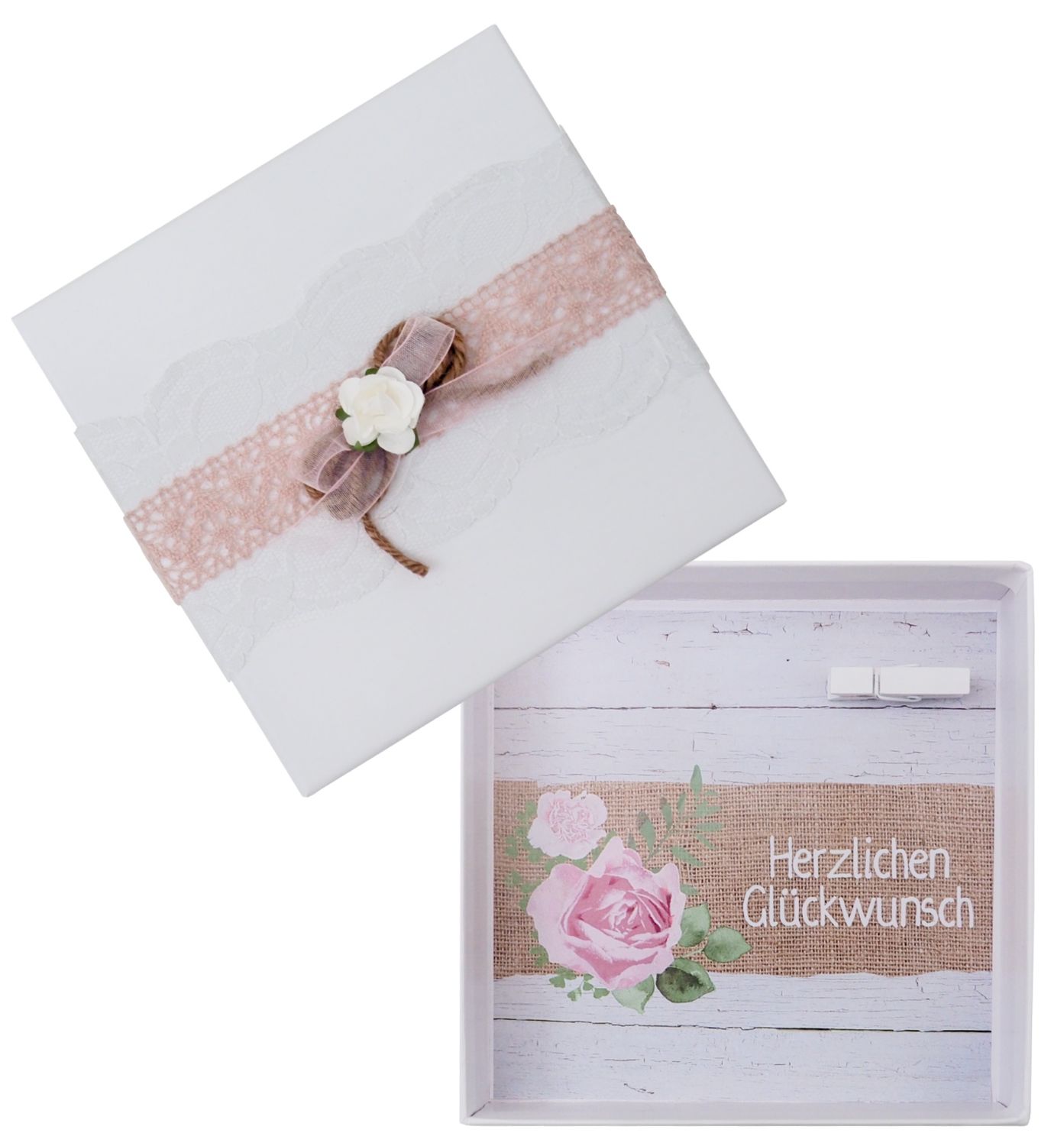 Außen ist die Box verziert mit je einem Spitzenband in weiß und rosa, Naturkordel, Organza in rosa und einer weißen Rose