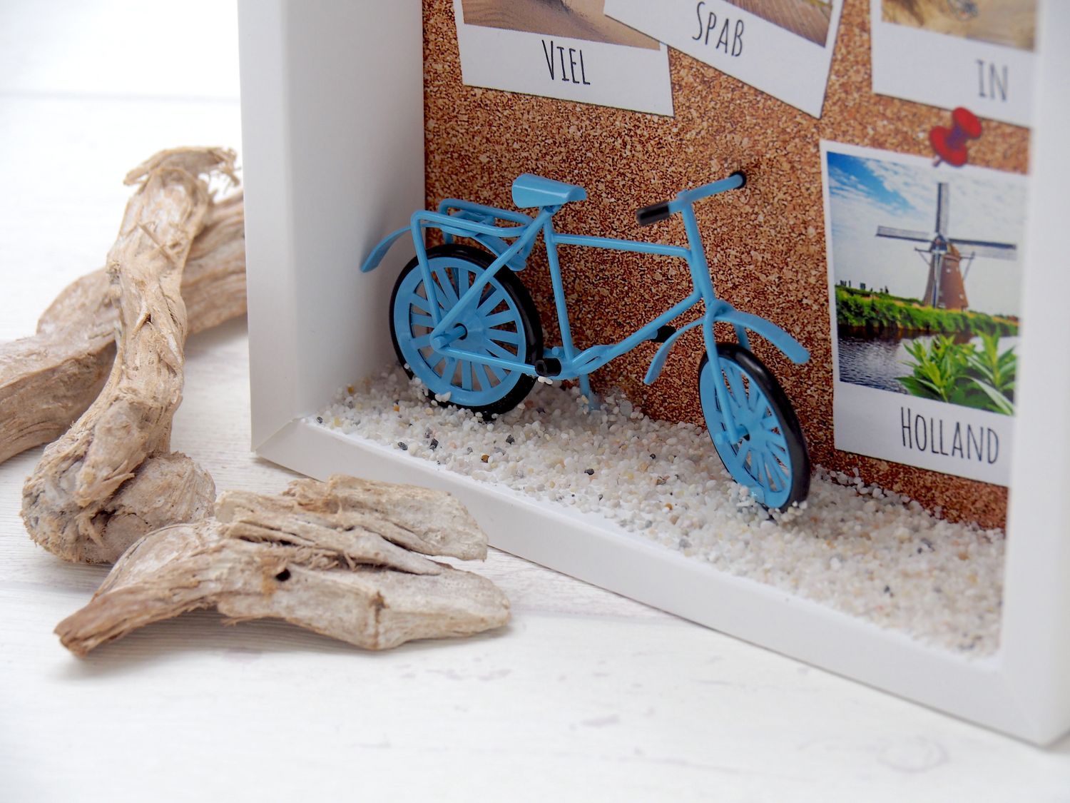 Inhalt: Ein blaues Miniatur-Fahrrad auf Sand und ein auf Papier gedrucktes Hintergrundbild.