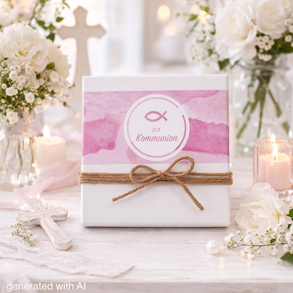 Die Box ist verziert mit einem Aufkleber "zur Kommunion" in Rosa - Weiß und einer Naturkordel