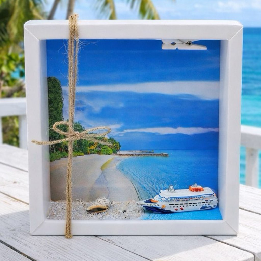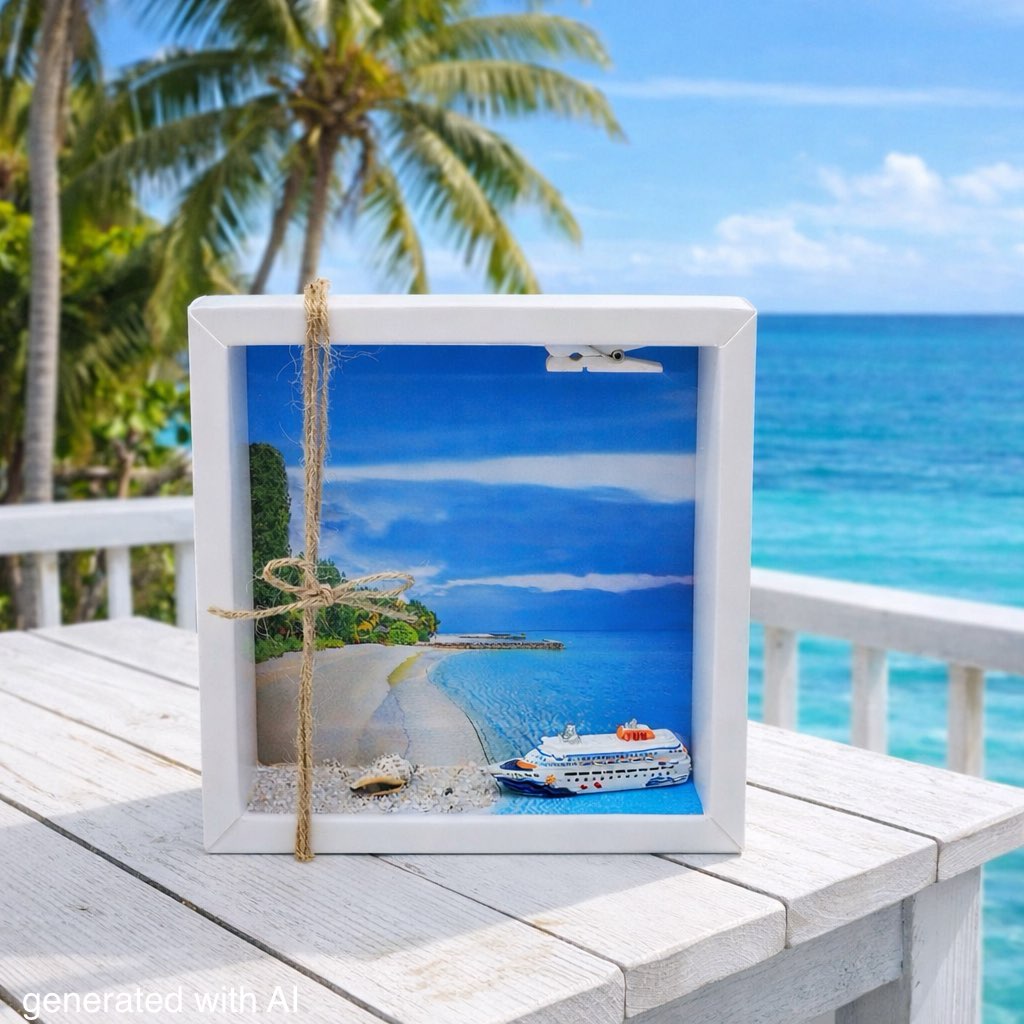 Inhalt: Ein Kreuzfahrtschiff Figur, Sand, Muscheln sowie ein Hintergrundbild auf Papier gedruckt
