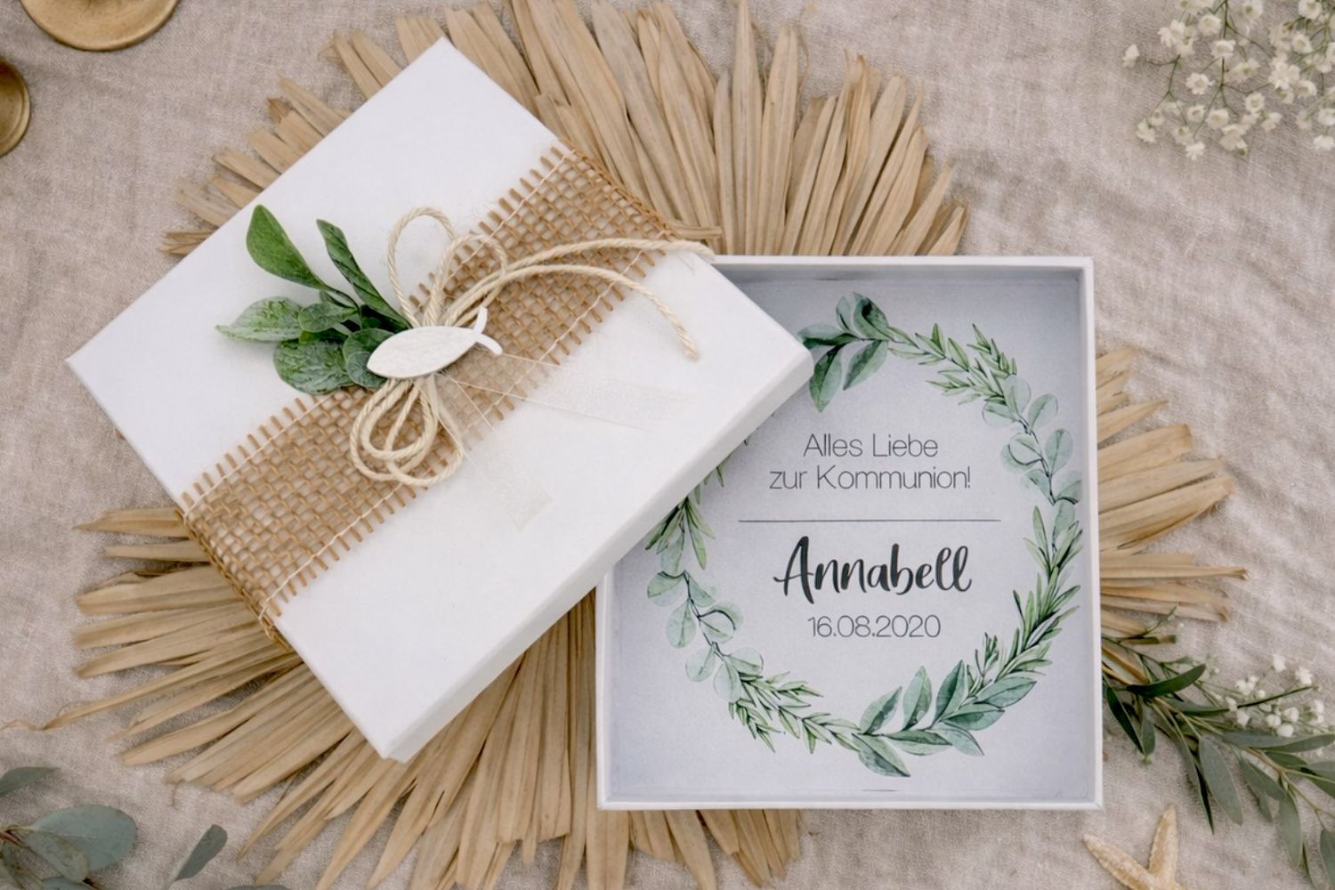 Innen ist abgebildet ein Blattkranz und dort wird der Anlass, Namen des Kindes sowie dem Datum des Festes bedrucktÂ