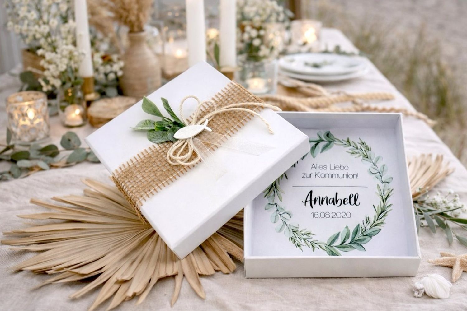 Außen ist die Box verziert mit Juteband, Naturkordel, Organzaschleife und ein Fisch aus Holz in Weiß