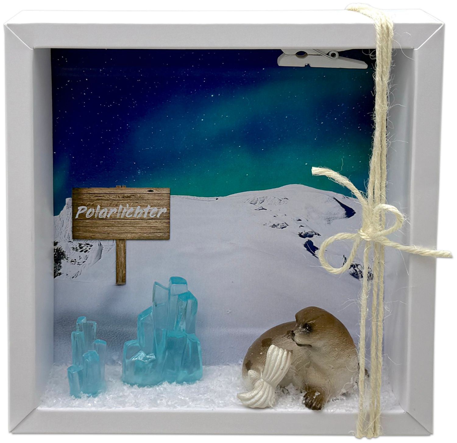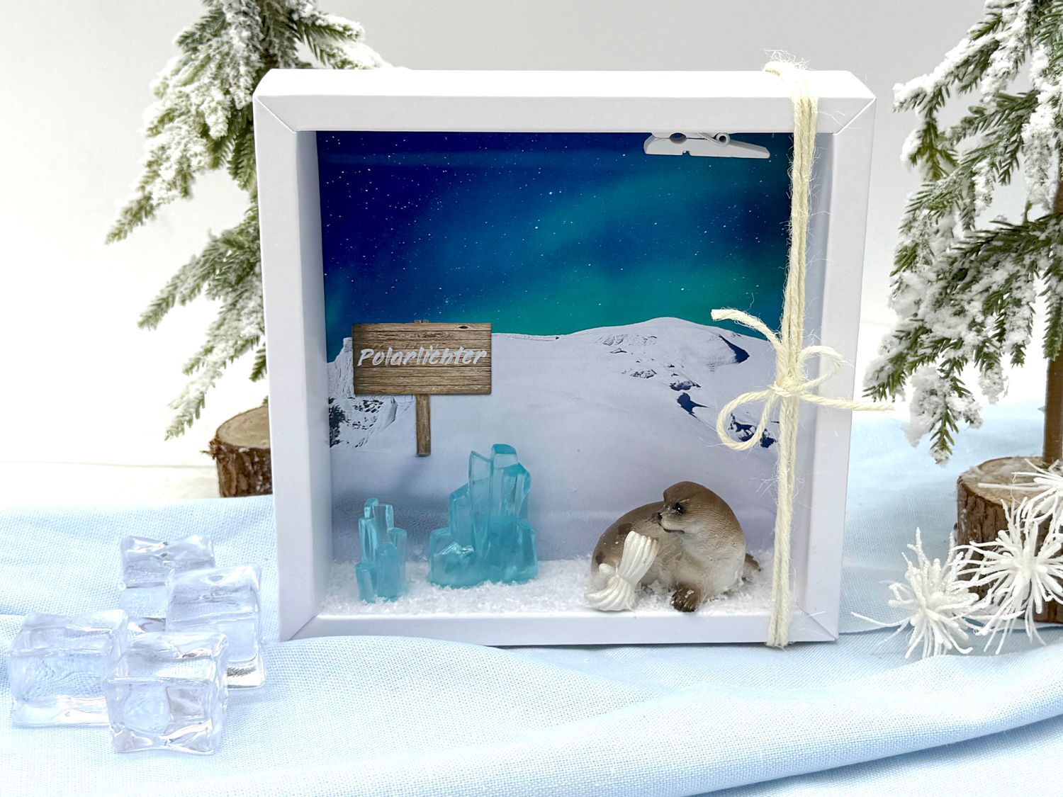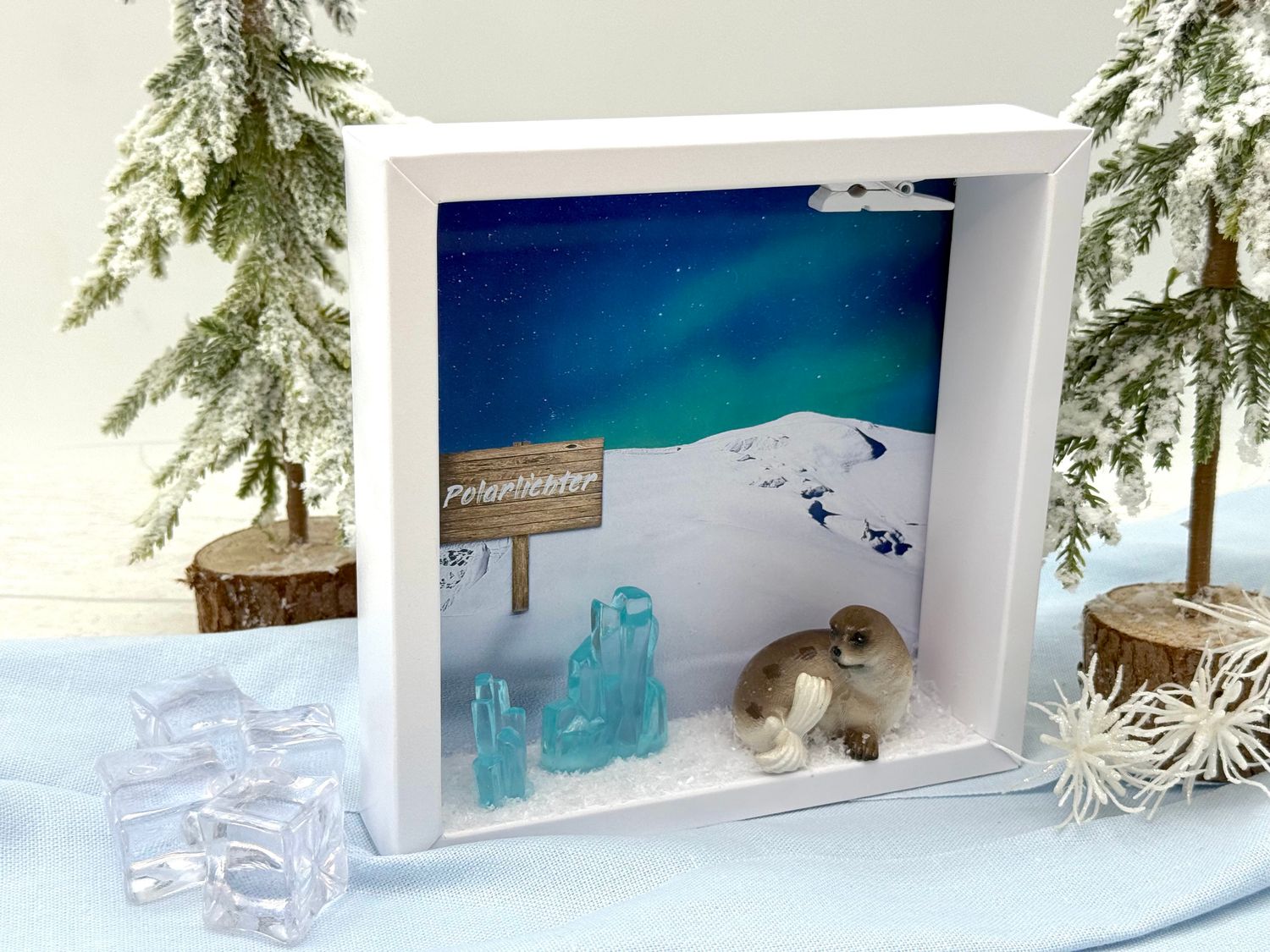Inhalt: Im Inneren der Verpackung finden Sie einen Miniatur-Seehund, der auf Kunstschnee sitzt, zwei kleine Eisberge, sowie ein auf Papier gedrucktes Hintergrundbild, das die malerische Schönheit der Polarlichter einfängt.