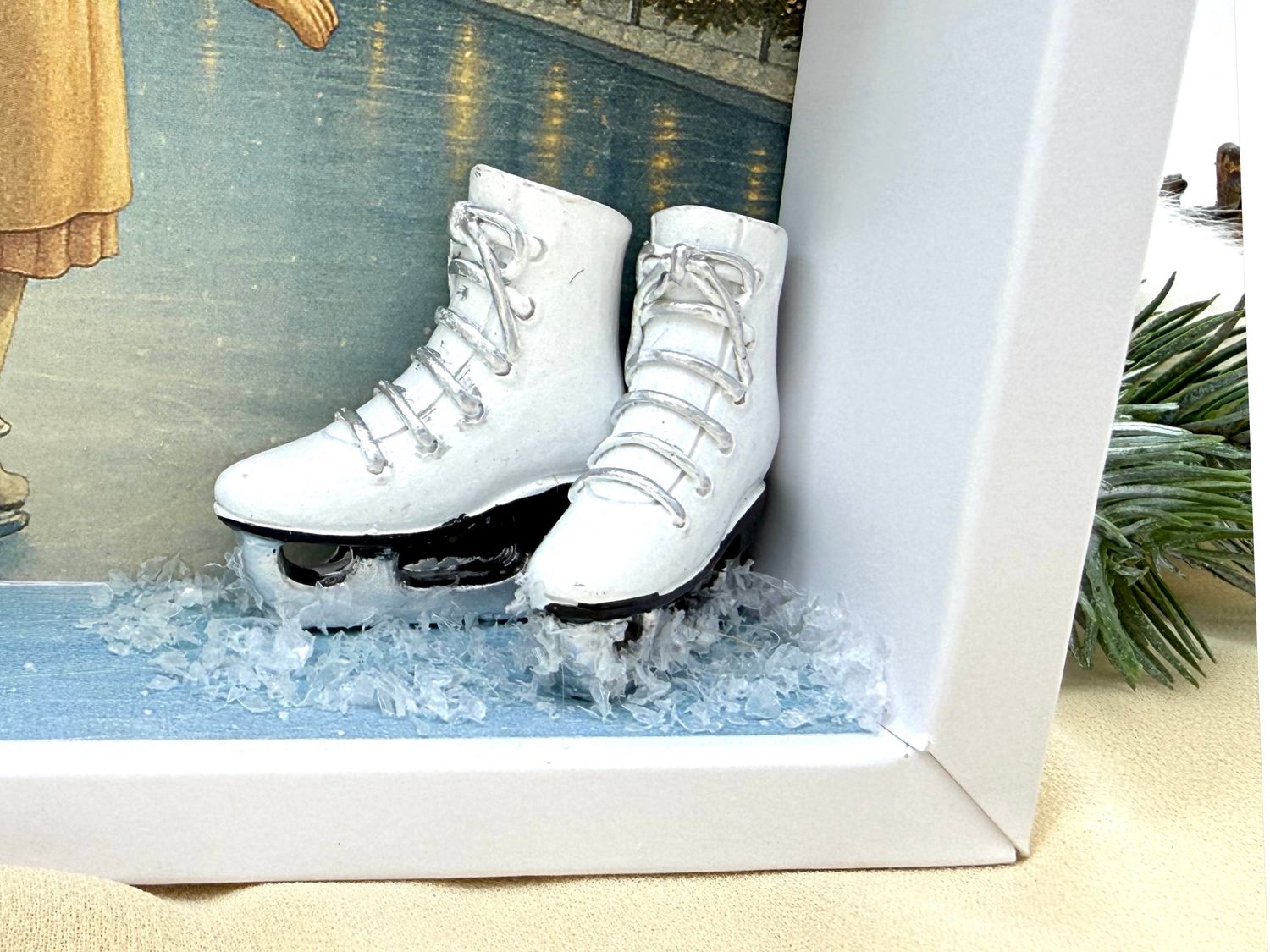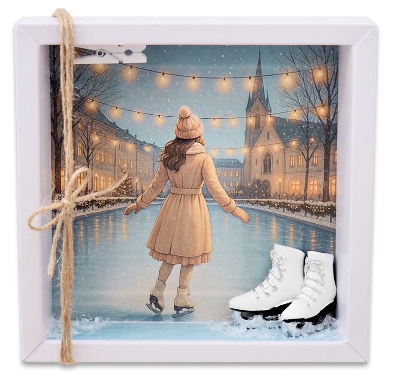 Inhalt: Ein auf Papier gedrucktes detailreiches Hintergrundbild Eisbahn Winterstadt Motiv, Mini-Schlittschuhe & etwas Kunstschnee