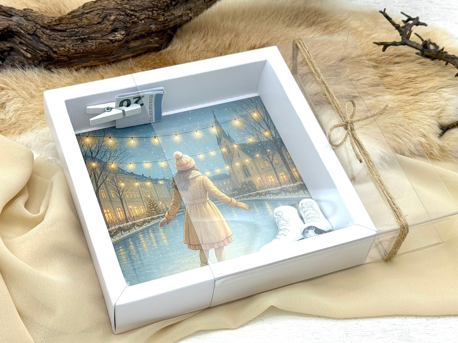 Eine Geldgeschenk Verpackung zum Thema Schlittschuhlaufen, aus fester, weißer Kartonage mit transparentem Schiebedeckel.