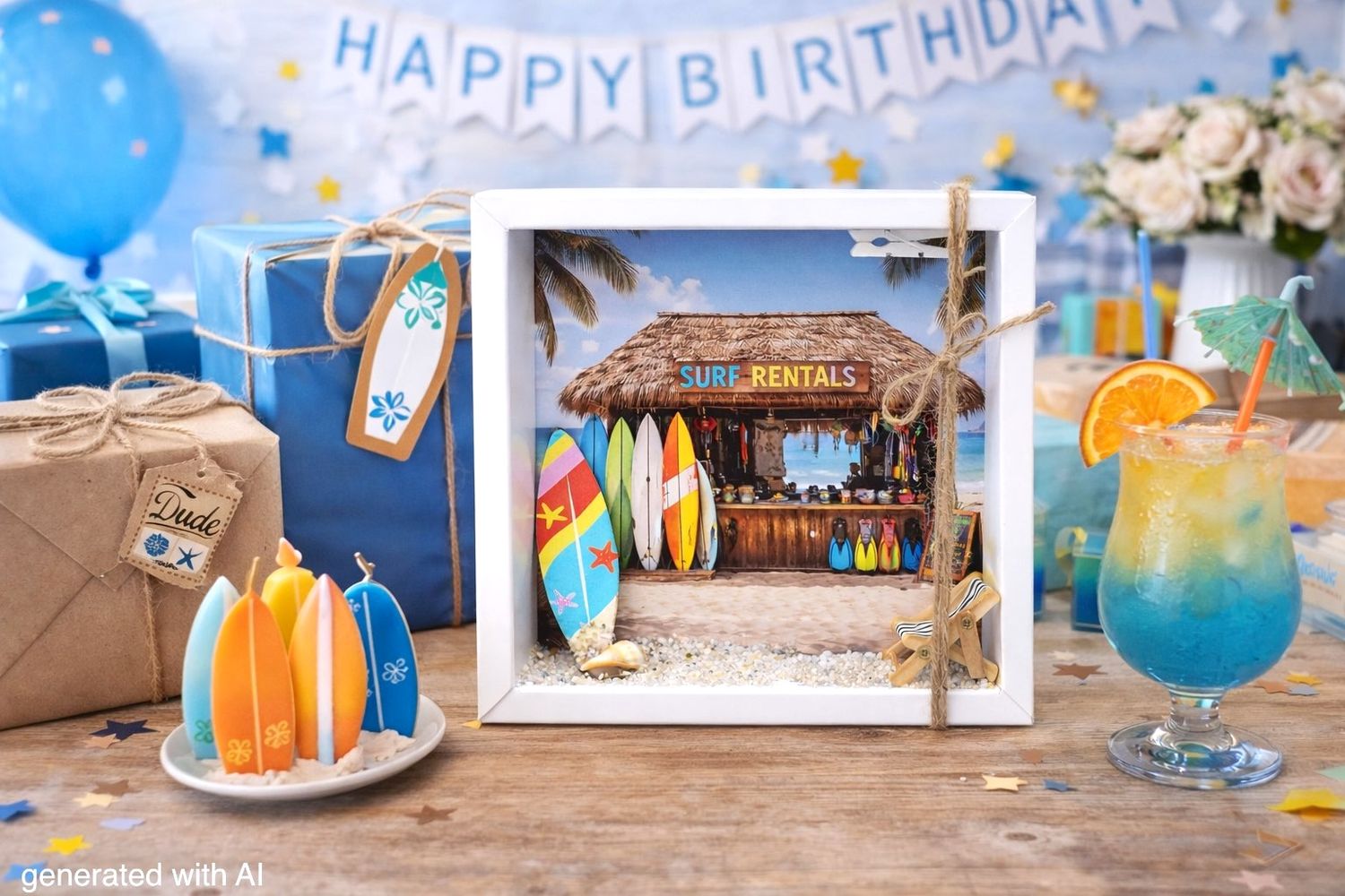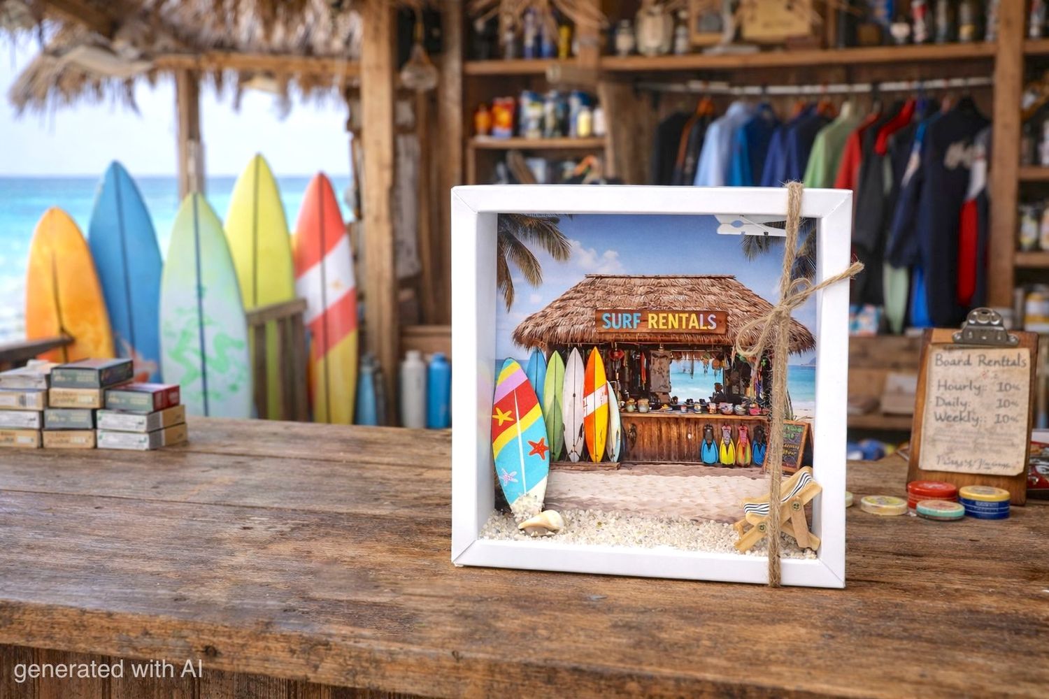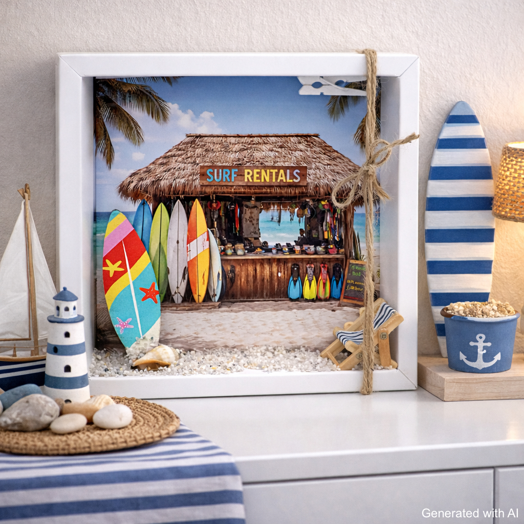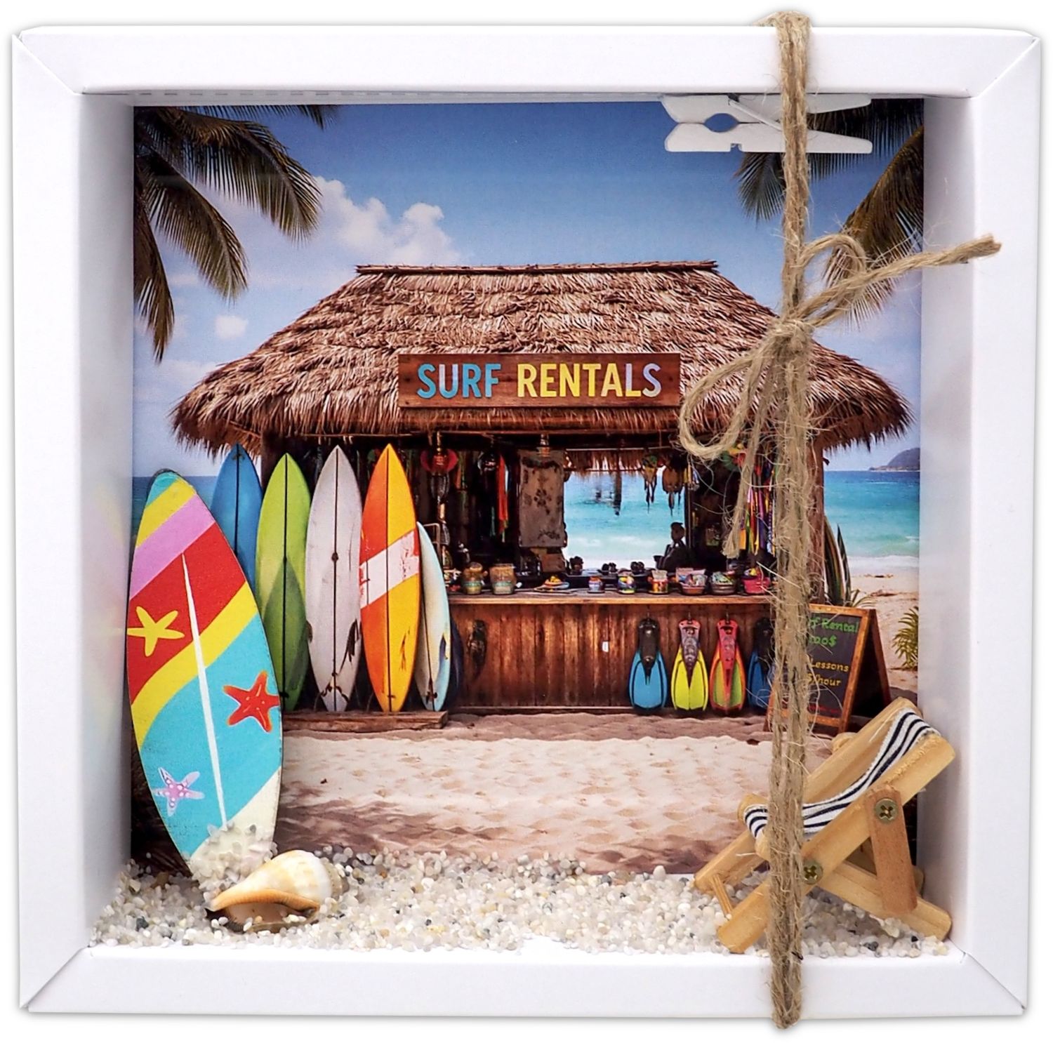 Inhalt: Ein Surfbrett, etwas Sand mit einer Muschel, sowie ein Liegestuhl Figur und ein Hintergrundbild mit Strand, Meer und einem Surfbrett - Verleih auf Papier gedruckt.