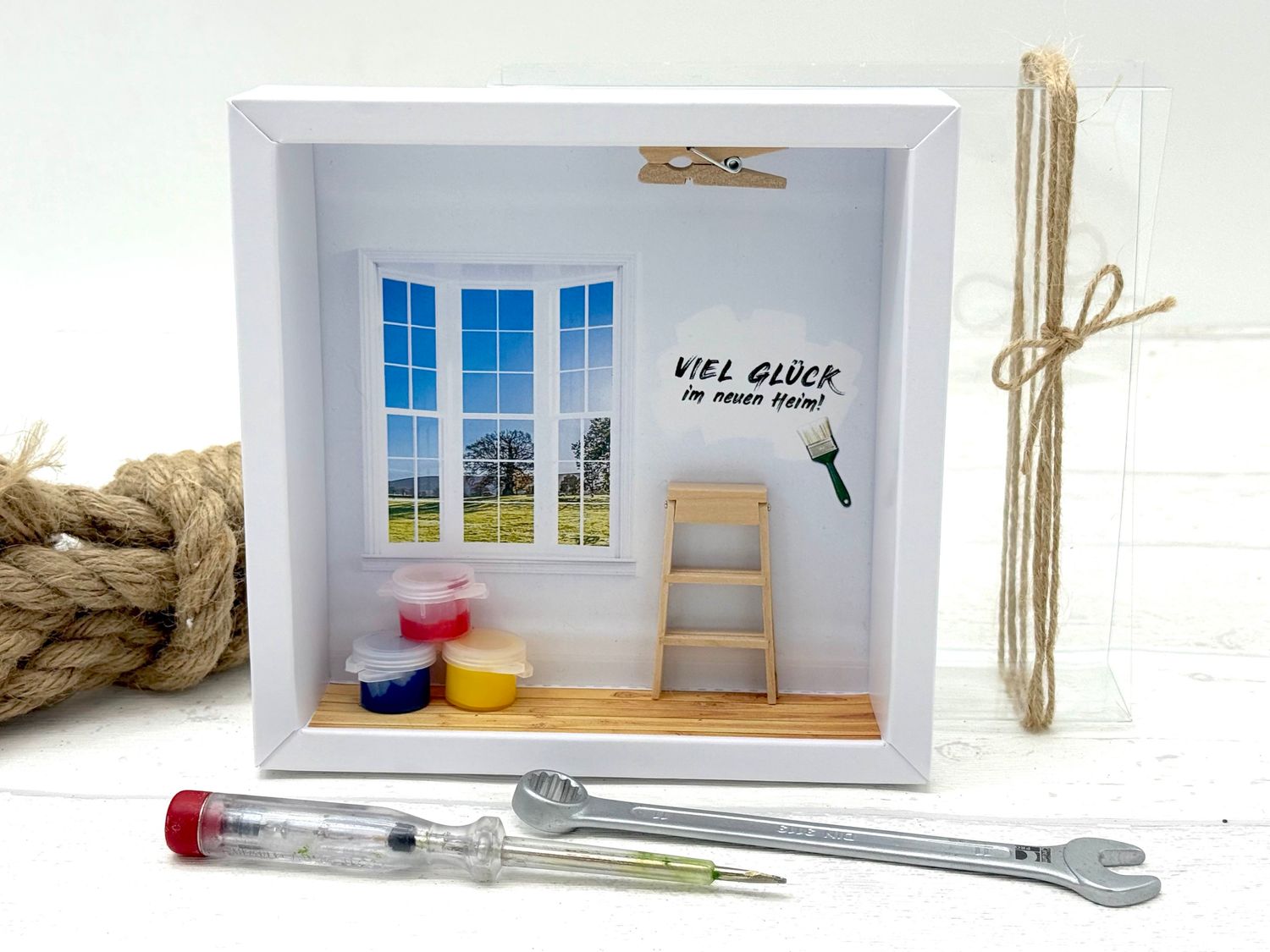 Inhalt: Eine kleine Figur "Mini-Stehleiter" und drei kleine Farbeimer mit Farbe aus Kunstoff, eine kleine Holzklammer sowie ein auf Papier gedruckter Hintergrund.