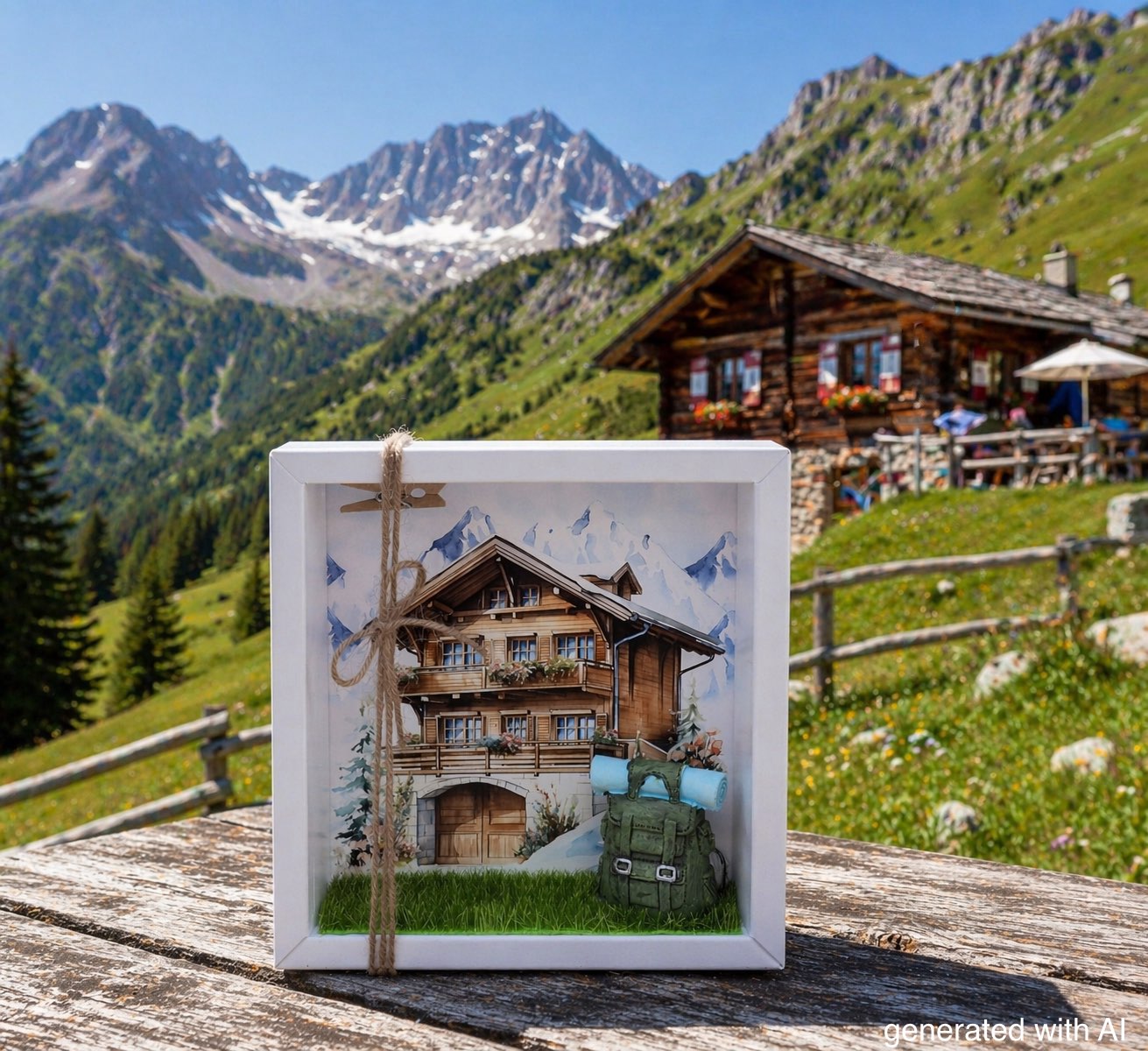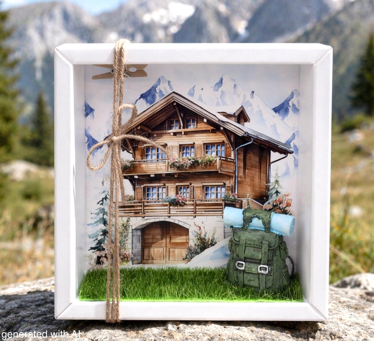 Inhalt: Ein grüner Rucksack Matte auf Kunstgras und ein auf Papier gedrucktes Hintergrundbild einer Berghütte mit Bergen im Hintergrund