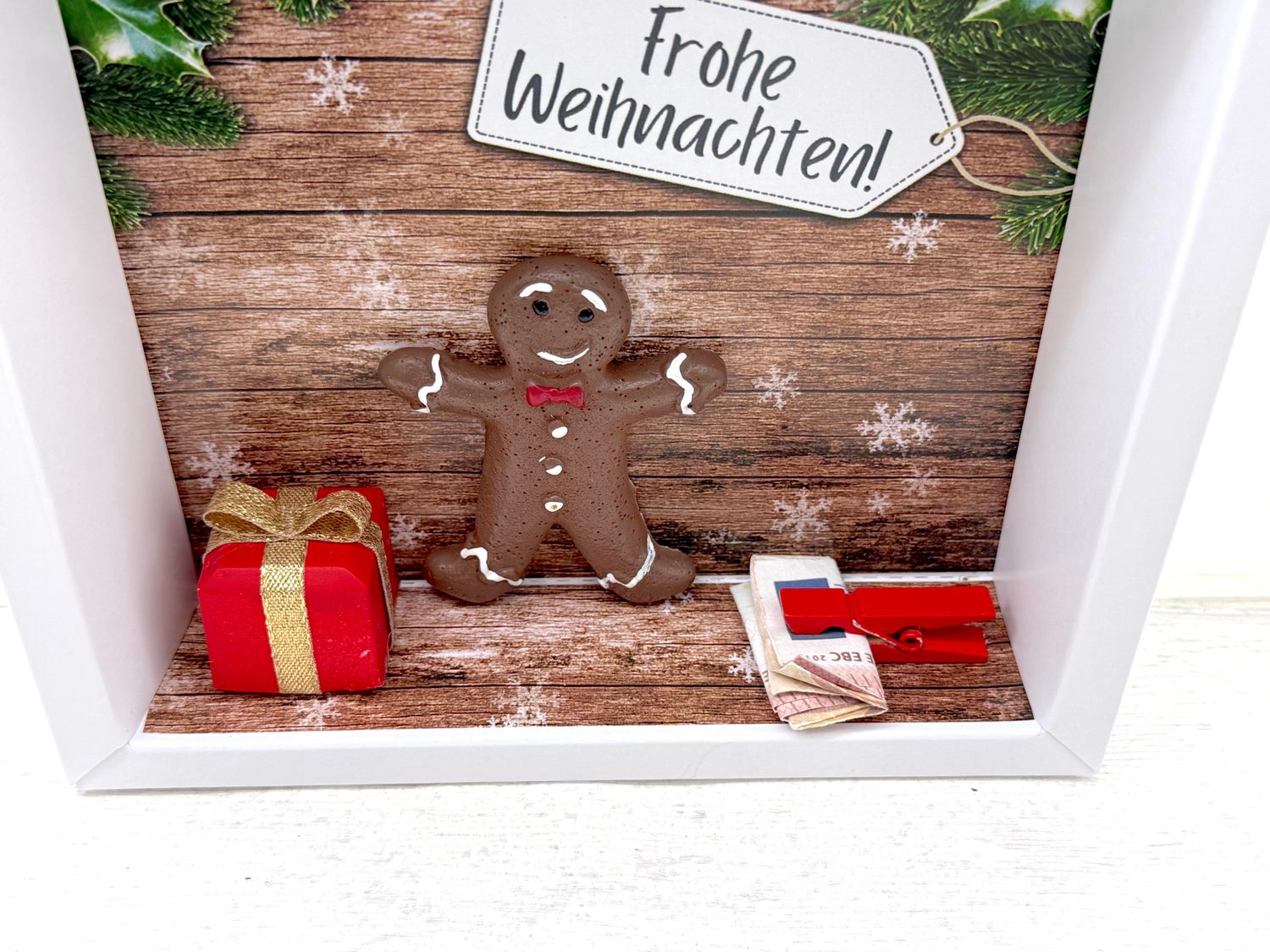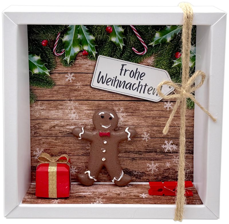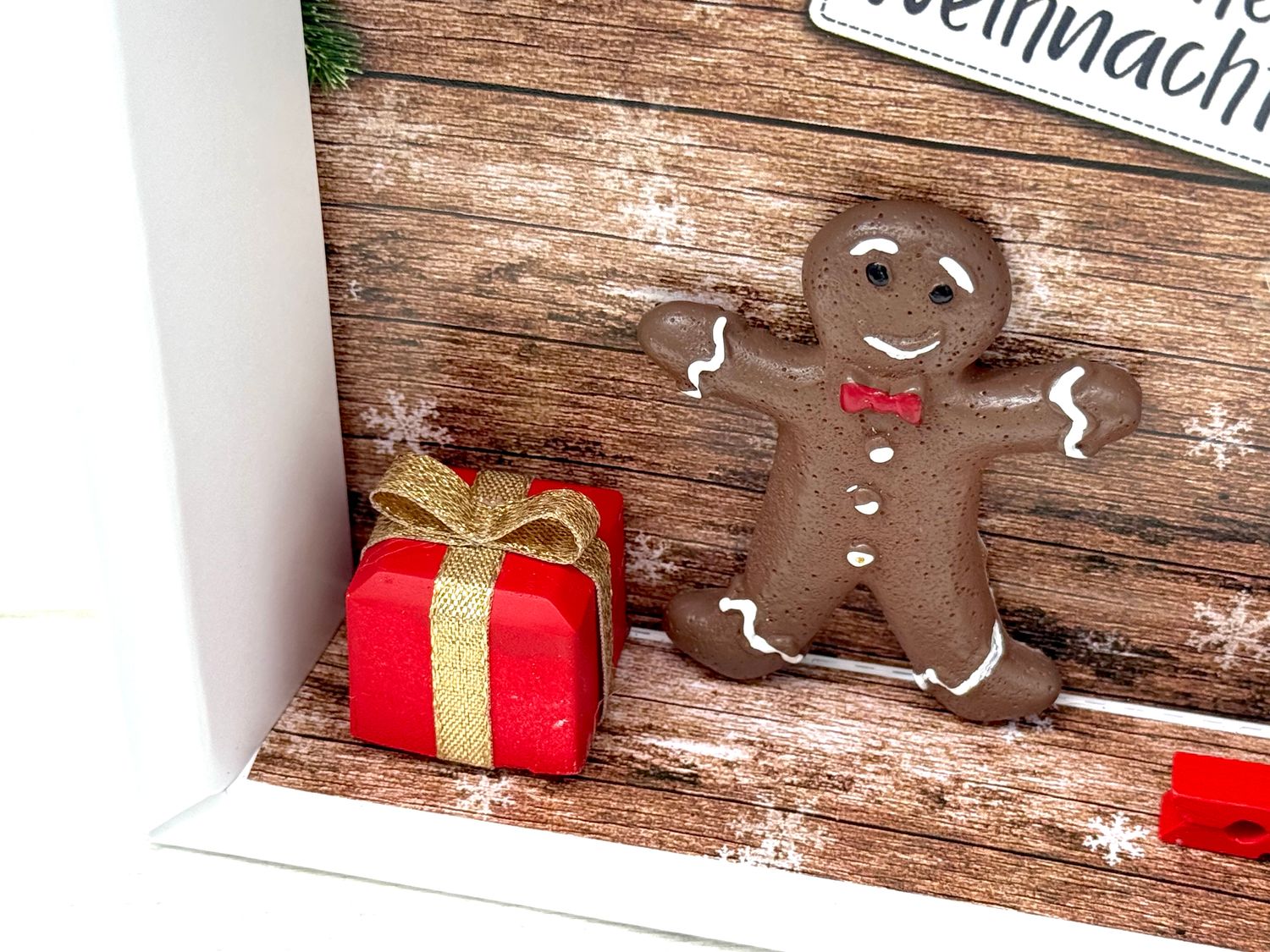 Inhalt: ein handgefertigtes Geschenk, sowie ein Lebkuchenmann, auf dem Hintergrundbild befindet sich eine Holzwand mit Schneeflocken, ein Anhänger mit "Frohe Weihnachten" drauf und Tannenzweige, sowie Ilex und Zuckerstangen.