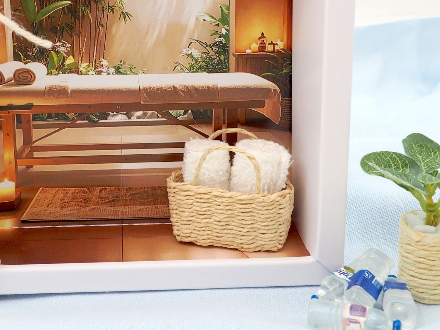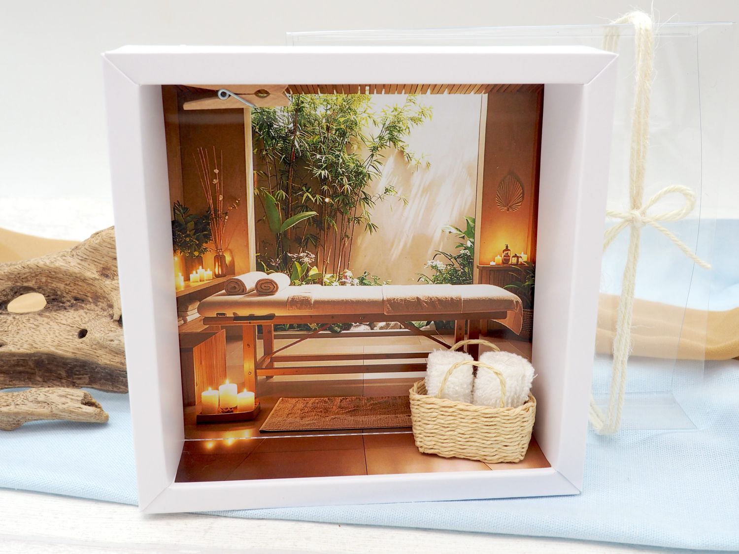 Inhalt: Ein Miniatur Körbchen mit zwei kleinen Handtüchern und ein auf Papier gedrucktes Hintergrundbild mit Massageraum Motiv mit mediterranem Flair.