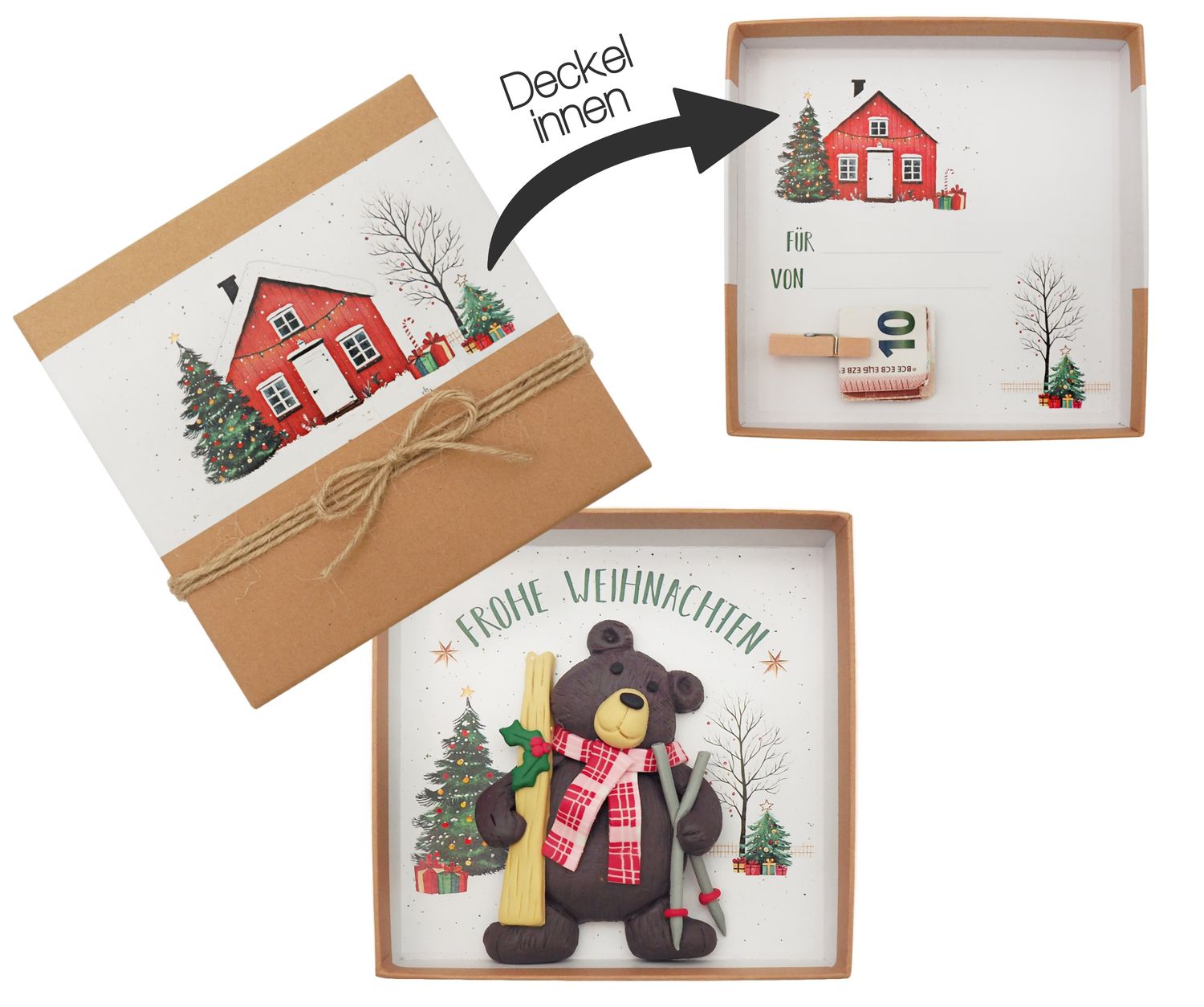 Innen auf dem Deckel befindet sich Motiv mit rotes Haus und Weihnachtsbäumen, beschriftbaren „Für & Von“-Linien und einer Klammer für Geld oder Gutscheine.