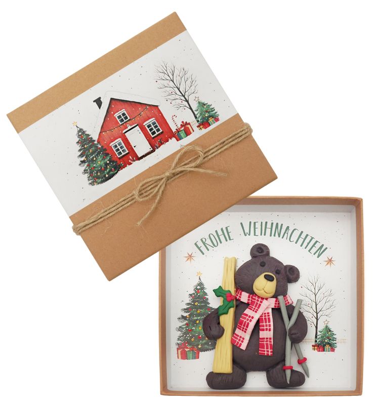 Innen auf dem Boden der Schatulle befindet sich ein weihnachtliches Motiv mit Tannen, Geschenken, dem Schriftzug „Frohe Weihnachten“ und einer Bärenfigur mit Schal in 2D, Skiern und Stöcken.