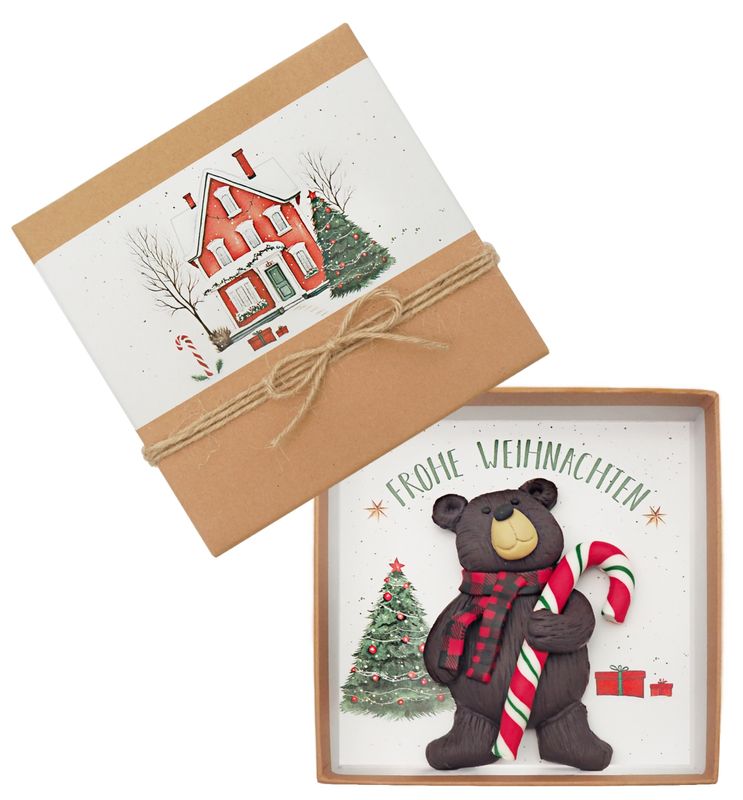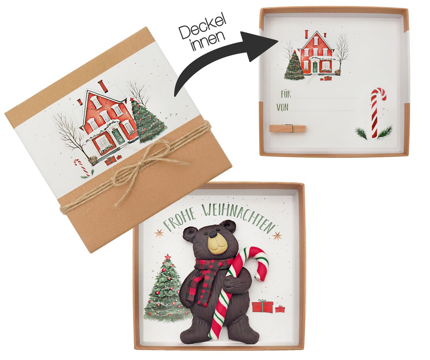 Innen auf dem Boden der Schatulle befindet sich ein weihnachtliches Motiv mit Tannen, Geschenken, dem Schriftzug „Frohe Weihnachten“ und einer Bärenfigur mit Schal und einer Zuckerstange in der Hand. .