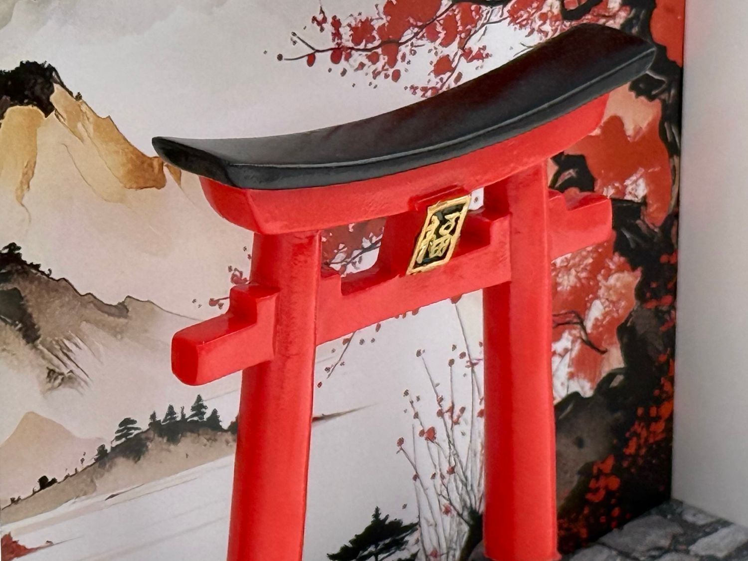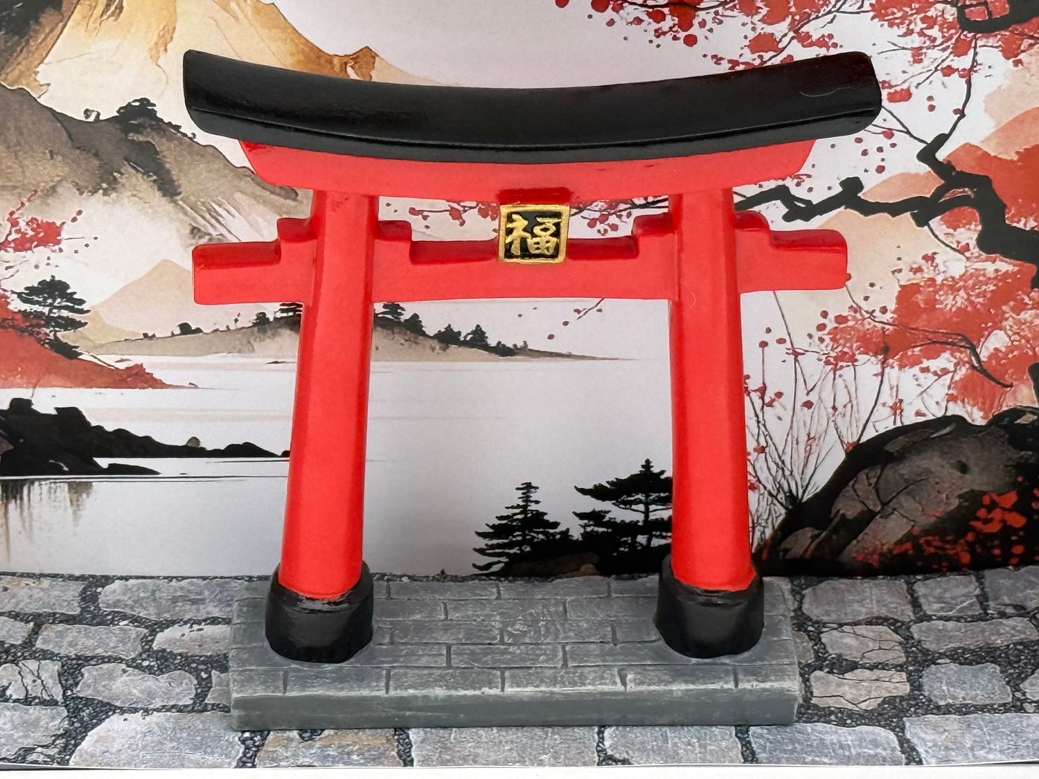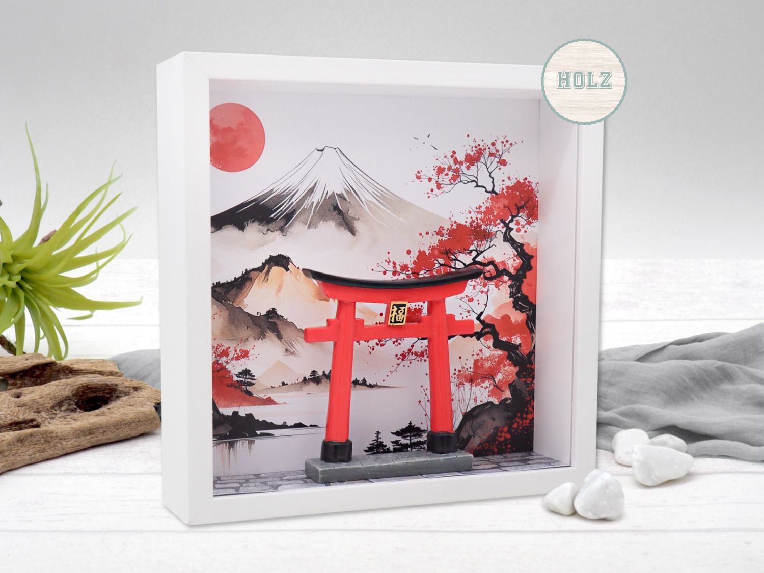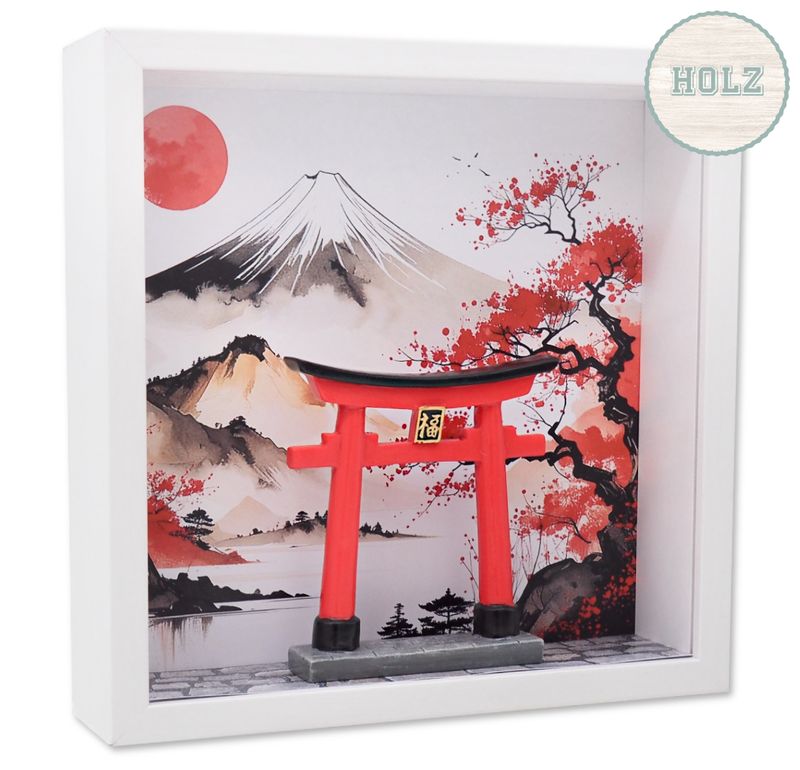 Hinter der klaren Acrylglas-Scheibe entfaltet sich eine kleine, liebevoll gestaltete Szenerie: Ein typisch japanisches Tor (Torii) steht vor einer idyllischen Landschaft in Weiß, Schwarz und Rot – ein harmonisches Farbspiel, das Ruhe, Eleganz und fernöstlichen Charme ausstrahlt.