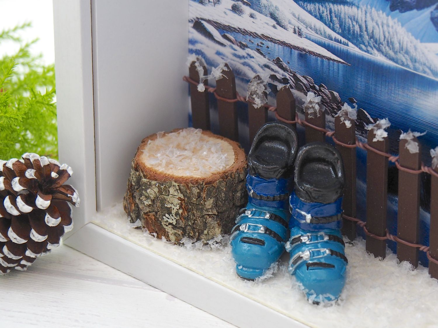 Inhalt: Ein Paar Miniatur Skischuhe, Skier und Skistöcke ein beschneiter Baumstamm und ein brauner Zaun, wo die Skiausrüstung angelehnt wurde und ein auf Papier gedrucktes Hintergrundbild einer Winterlandschaft.