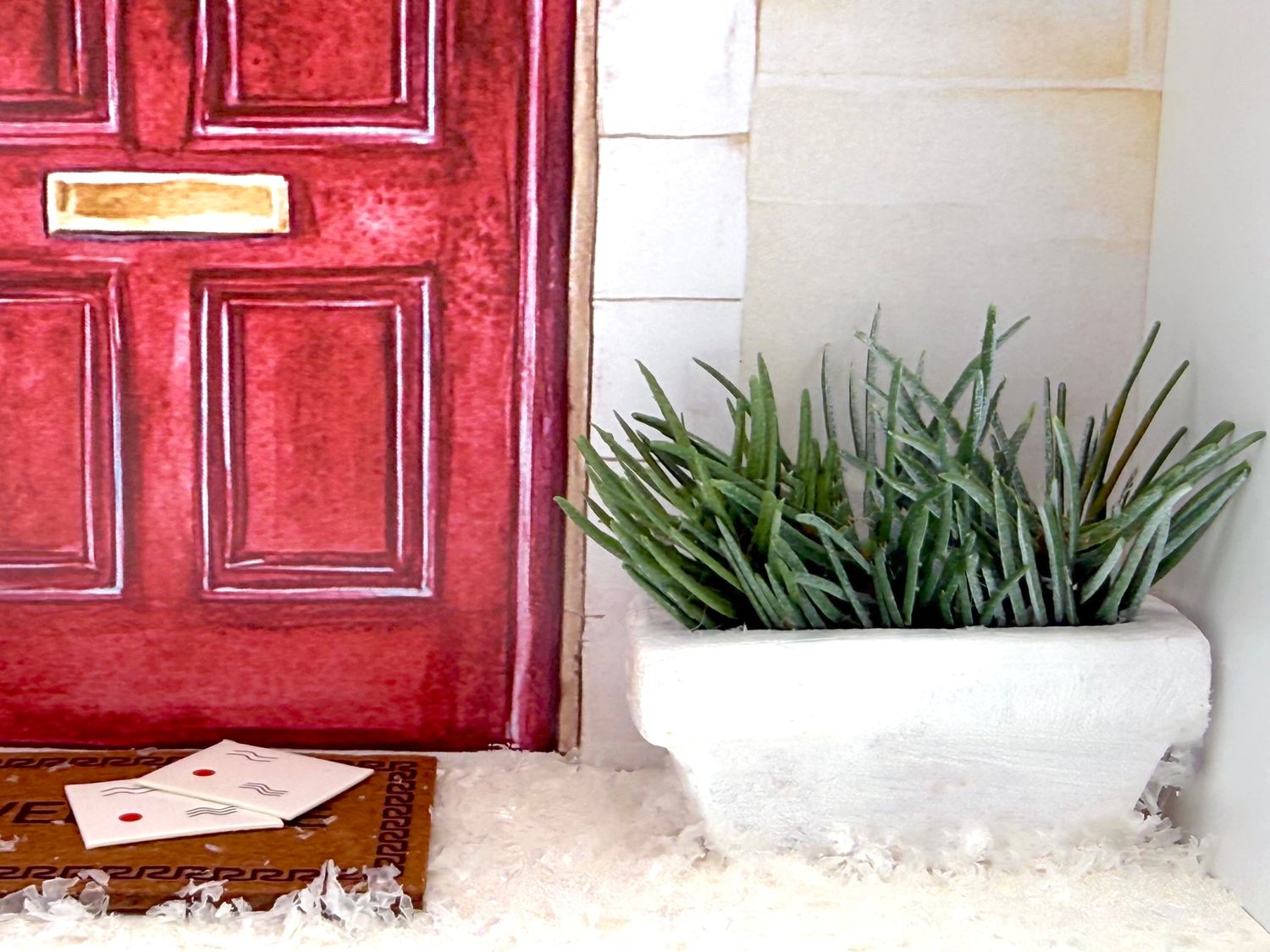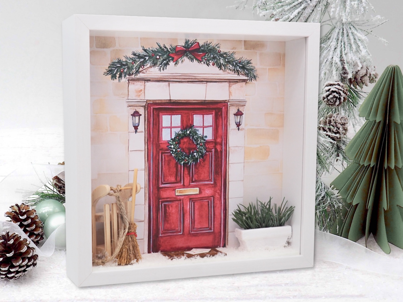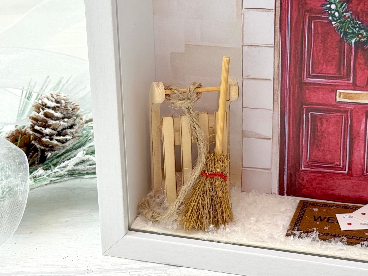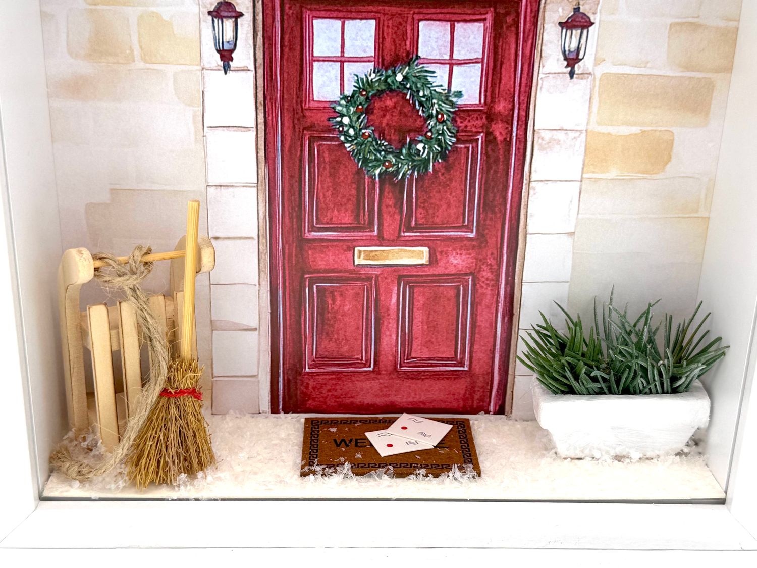 Inhalt: Eine Pflanze im weißen Terrakotta Topf, Besen, Schlitten und Fußmatte auf der Briefe (Weihnachtspost) liegen und Kunstschnee, sowie ein auf Papier gedrucktes Hintergrundbild mit einer geschmückten Eingangstüre in Rot.