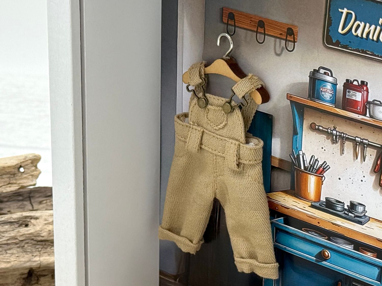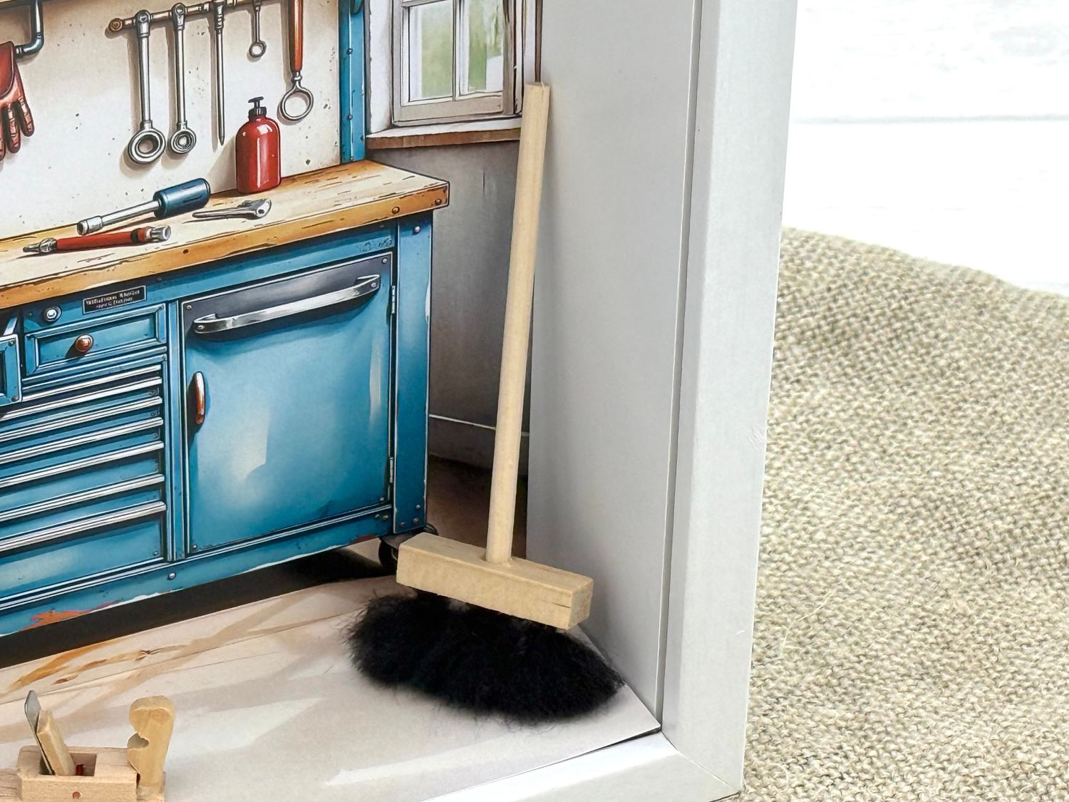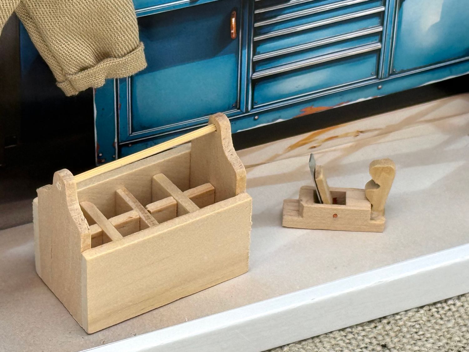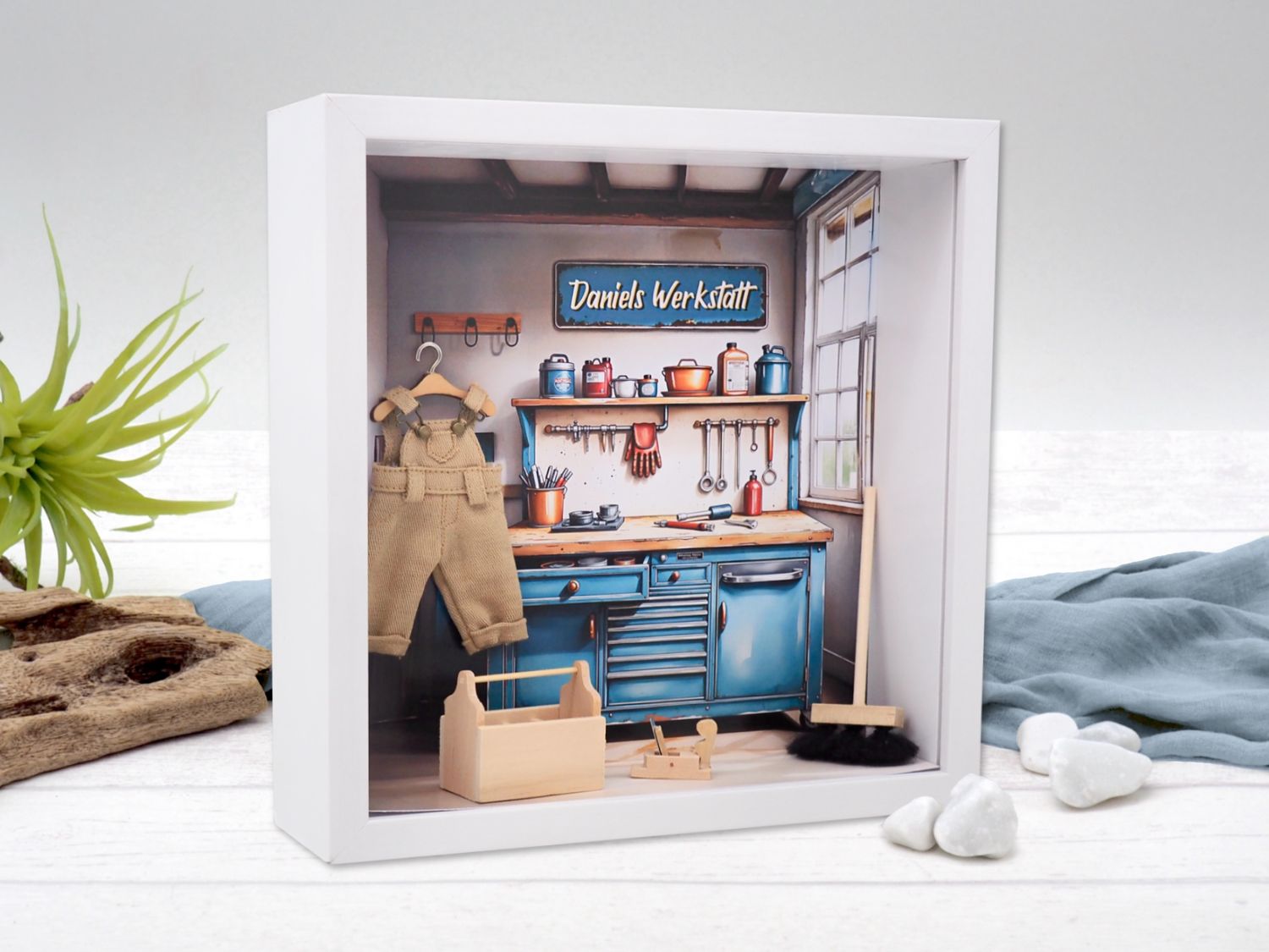 Inhalt: Miniatur Werkzeugbox, Holzhobel, Besen, Mini-Latzhose am Kleiderbügel sowie Hintergrundbild mit Werkstatt-Design mit Schild für den Namen.
