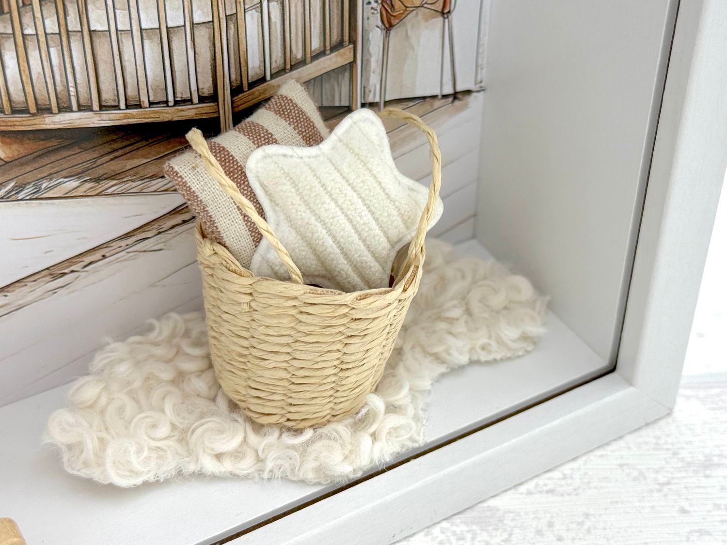 Inhalt: Ein kleiner geflochtener Korb mit zwei Kissen in Beige gestreift und ein weißer Stern, eine Mini Schaukelpferd auf dem ein Teddybär sitzt und ein Herzkissen liegt und ein auf Papier gedrucktes Hintergrundbild mit eines Kinderzimmers mit Himmelbett und ein Bilderrahmen, wo der Namen des Kindes als Personalisierung verewigt werden kann.