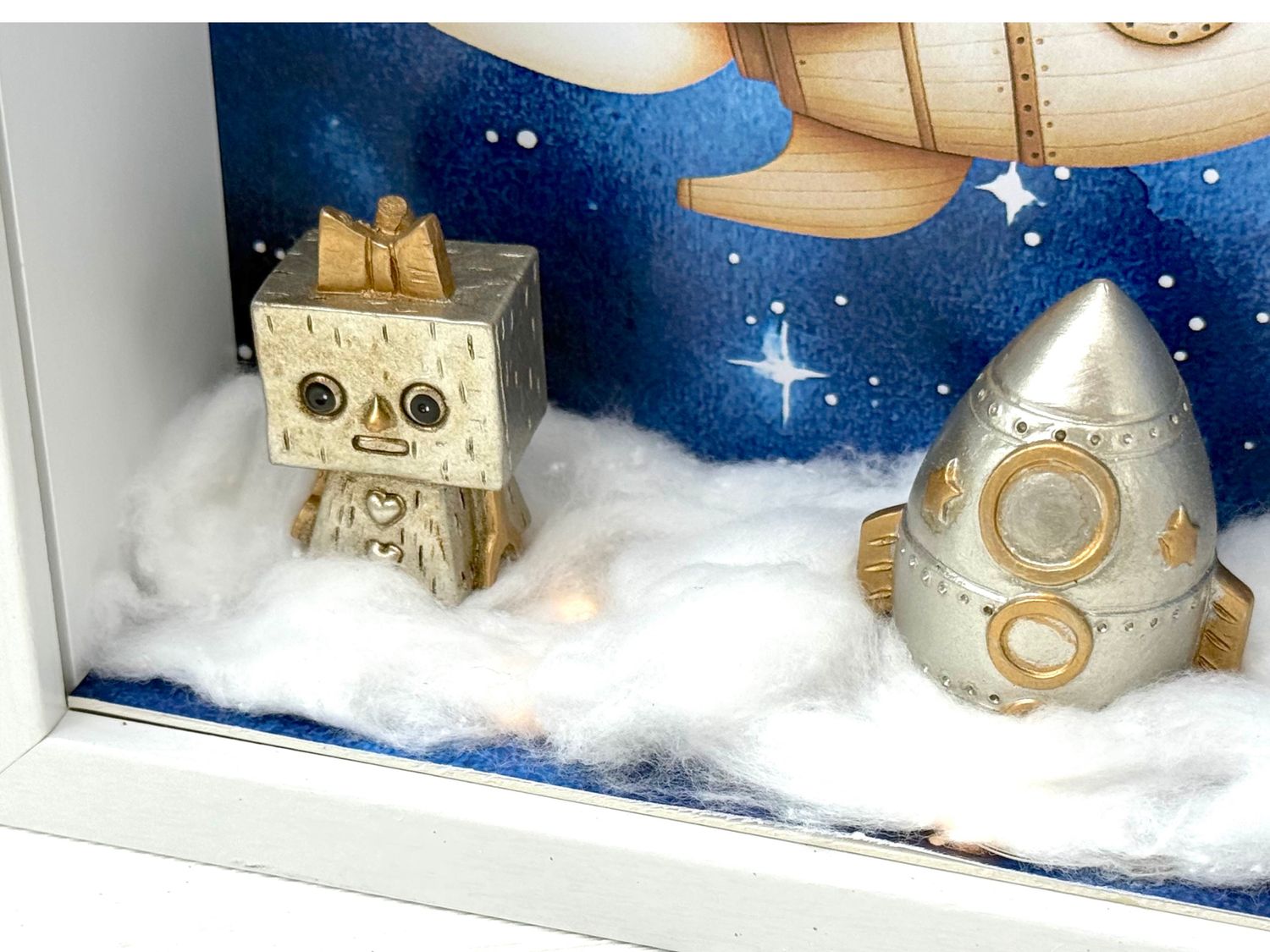 Inhalt: Ein kleiner Mädchen Roboter mit Schleife und eine kleine Rakete die in den Wolken stehen. In den Wolken befindet sich eine Lichterkette, dazu ein auf Papier gedrucktes Hintergrundbild des Weltraums, ein Astronaut, der auf einer Rakete mitfährt, sowie ein Planet und ein großer Stern wo der Namen des Kindes als Personalisierung verewigt werden kann. Ganz oben steht der Satz: "Zwischen Sternen und Galaxien hast du deinen Weg zu uns gefunden."