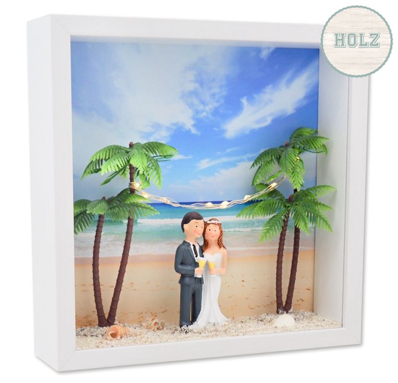 Geschenkrahmen Holz Diorama Geldgeschenk Gutschein Hochzeit Strand Strandhochzeit LED