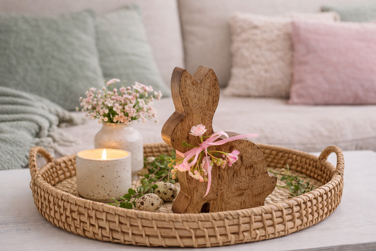 Ein Deko Hase aus Mangoholz dekoriert mit einer Schleife und kunst. Schleierkraut in Rosa