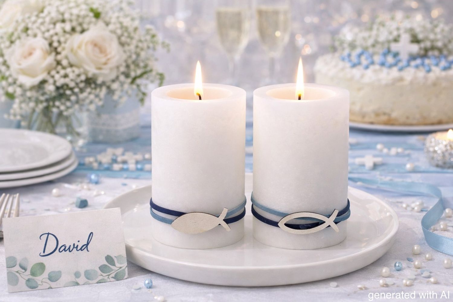Kerzen Stumpenkerzen Tischdeko Kommunion Konfirmation Weiß Blau Fisch 2 Stück