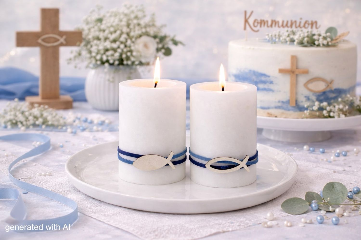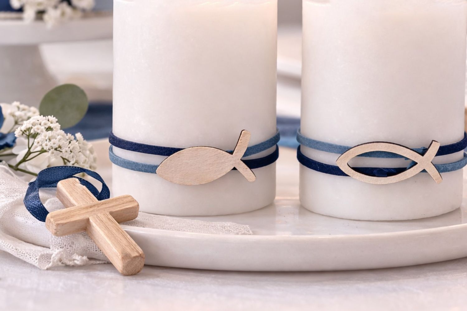 Zwei dekorierte Stumpenkerzen- Kerzen mit Holzfisch – Tischdeko Kommunion & Konfirmation