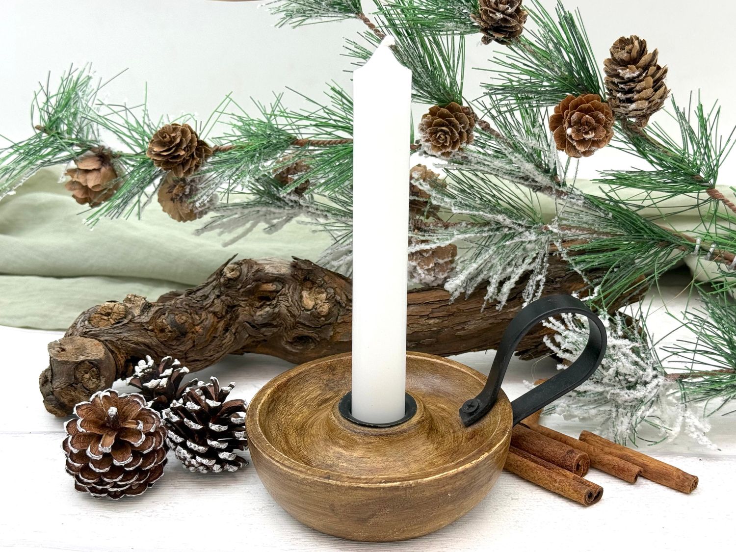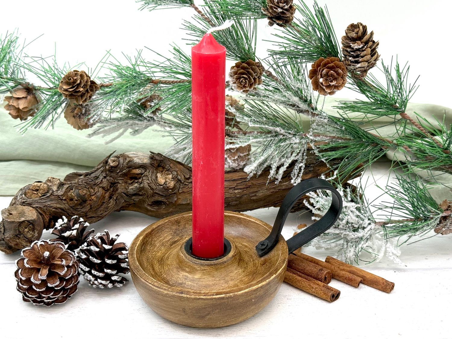 Kerzenhalter aus Mangoholz mit schwarzem Metallhenkel – stilvolle Vintage Tischdeko für jede Jahreszeit