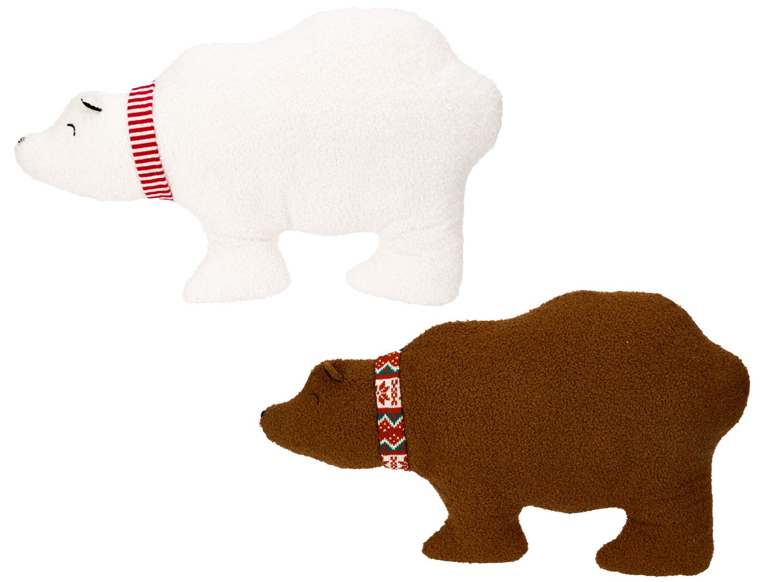 Ein Deko Kissen in Bärenform mit rotem Schal - Teddy-Stoff Optik, wahlweise in den Farben Braun (Braunbär) und Weiß (Eisbär).