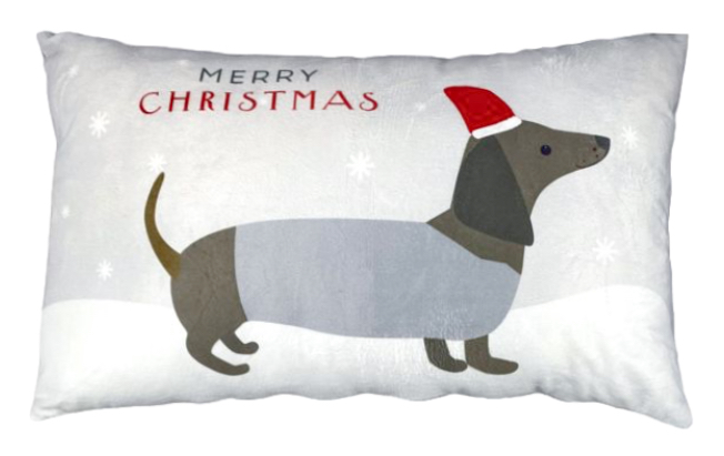 Ein Kissen mit einem Dackel mit grauen Pullover und mit dem Schriftzug ''Merry Christmas'' aus Polyester