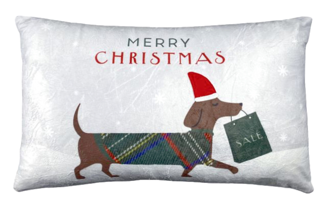 Ein Deko Kissen mit fröhliches Weihnachtsmotiv mit Dackel, Pullover, Mütze, Sale-Tüte und Schriftzug „Merry Christmas“