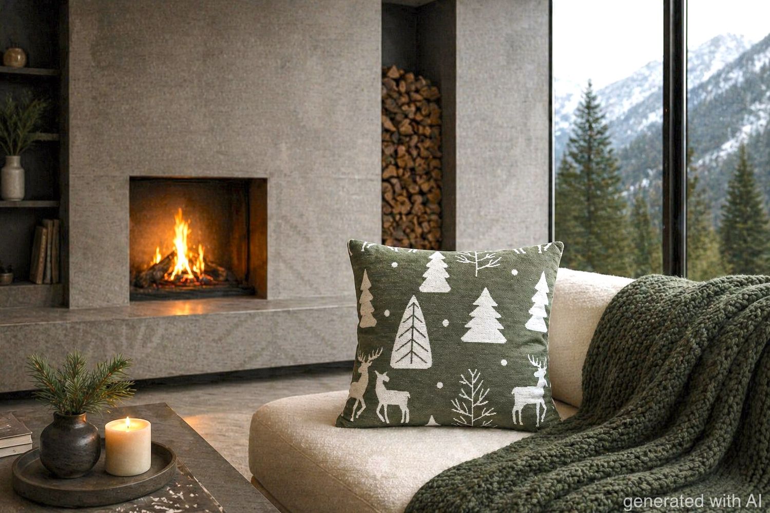 Modell Grün: Grünes Kissen mit weißen Tannenbäumen und Hirschen