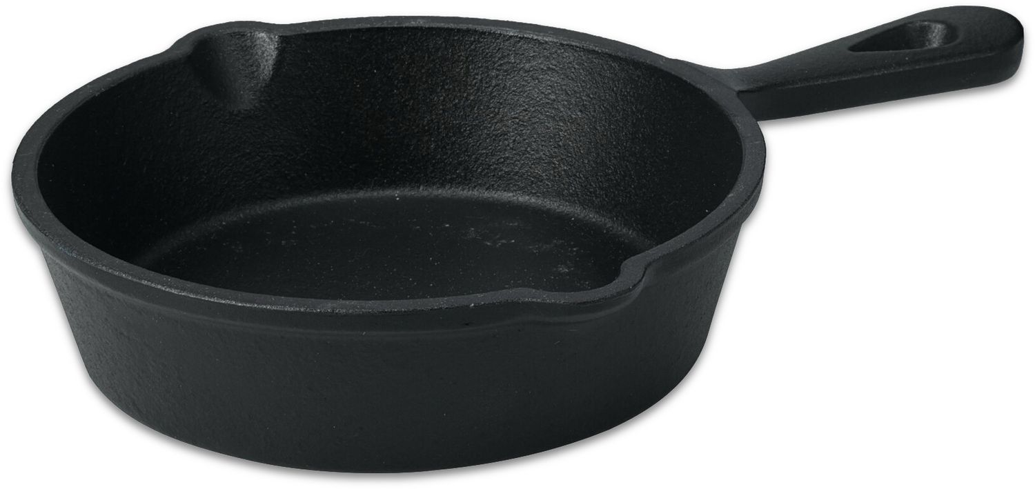 Eine kleine Tapas Servierpfanne aus gehärtetem Gusseisen mit angegossenem Stielgriff für einfachen Halt und zwei Ausgießern für tropffreies und sauberes Ausgießen von Saucen
