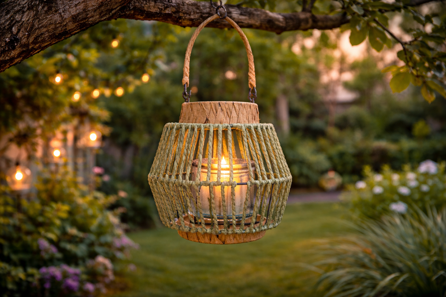 Eine Laterne aus Metall mit Papier in Grün und Braun umwickelt, mit einem Windlicht aus Glas