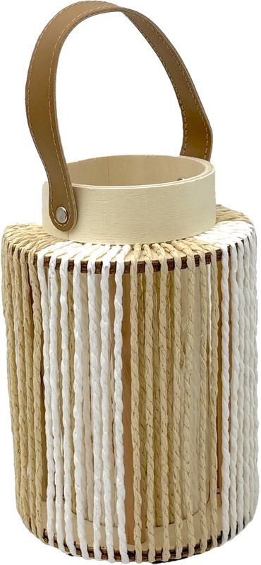 Eine Laterne aus MDF Holz mit Papier in Creme und Weiß umwickelt, mit einem Windlicht aus Glas und Aufhänger aus Kunstleder.