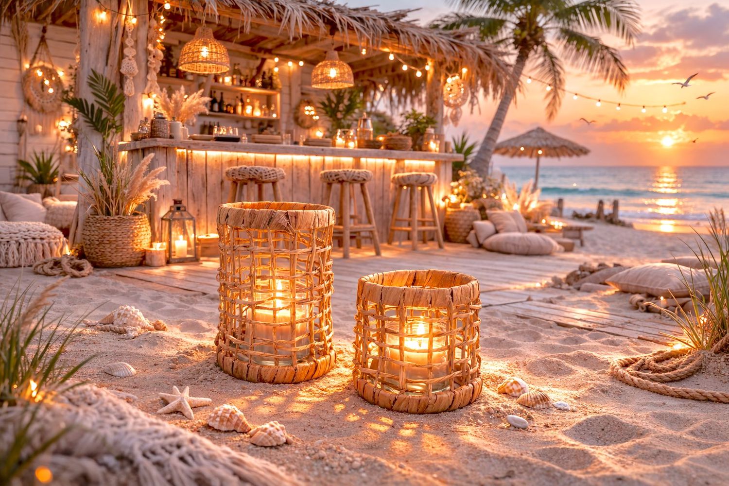 Das geflochtene Naturmaterial in Kombination mit der stabilen Metallhalterung verleiht der Laterne einen modernen Boho- und Strandhaus-Look.