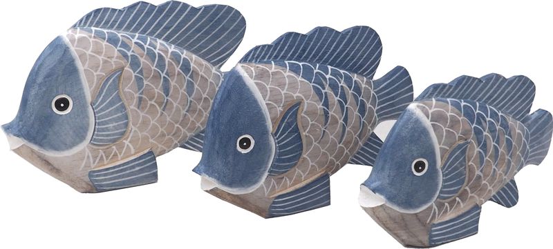 Drei Deko Fisch aus Holz in blau & grau zum Hinstellen in drei verschiedenen GroßenÂ