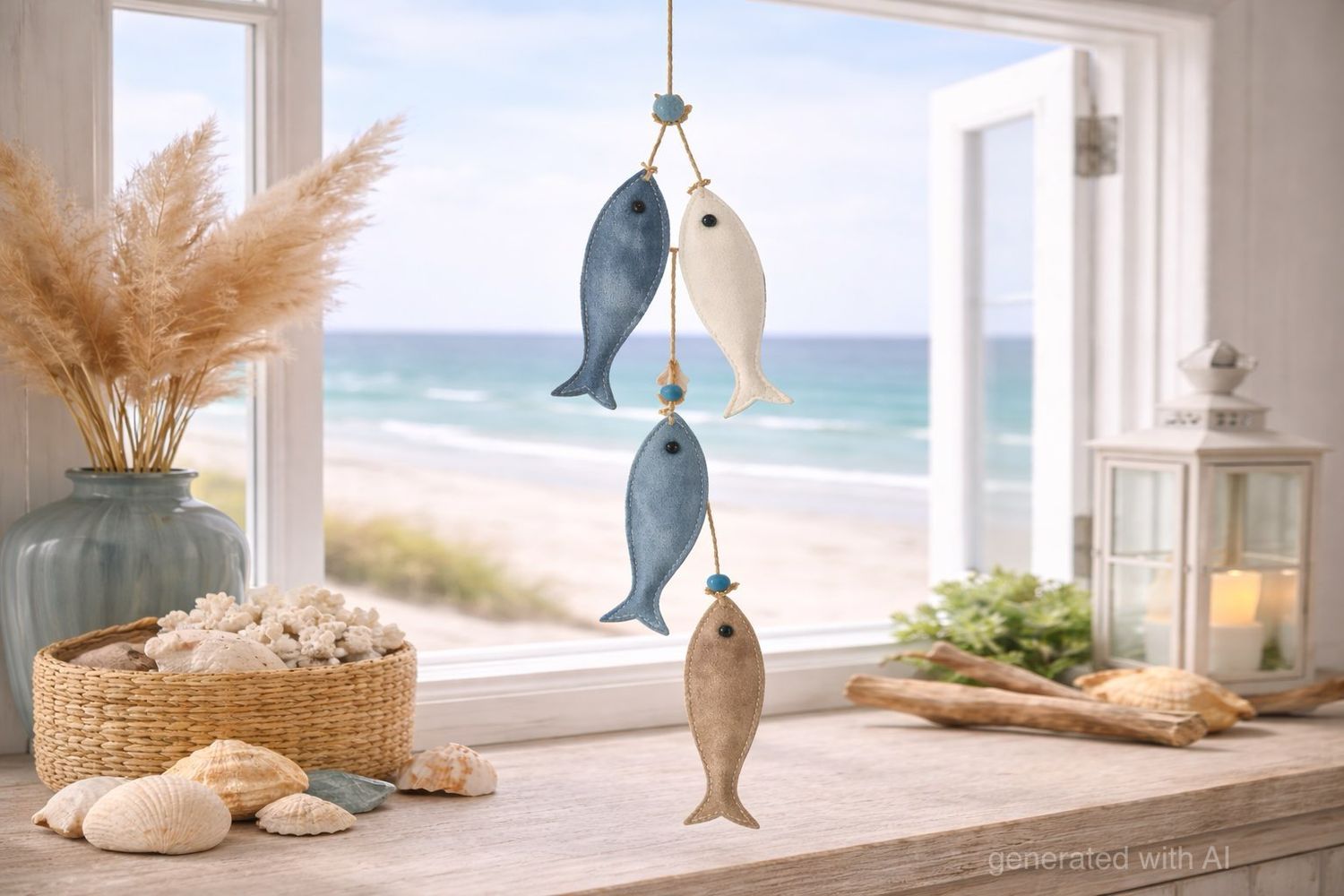 Eine dekorative Maritime Girlande mit Fischen, kleinen Perlen und kleinen Muscheln.
