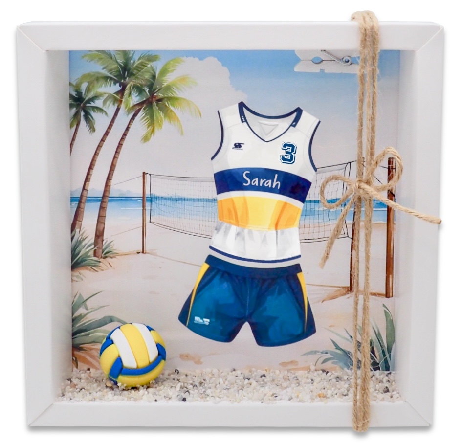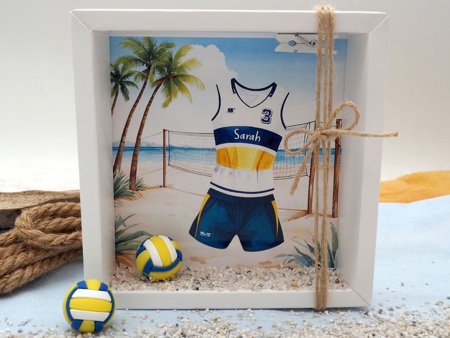 Inhalt: Ein auf Papier gedrucktes Hintergrundbild mitMotiv Volleyball (Volleyball Trikot-Set und Volleyball Spielfeld) und ein Miniatur Volleyball Ball und etwas Sand.