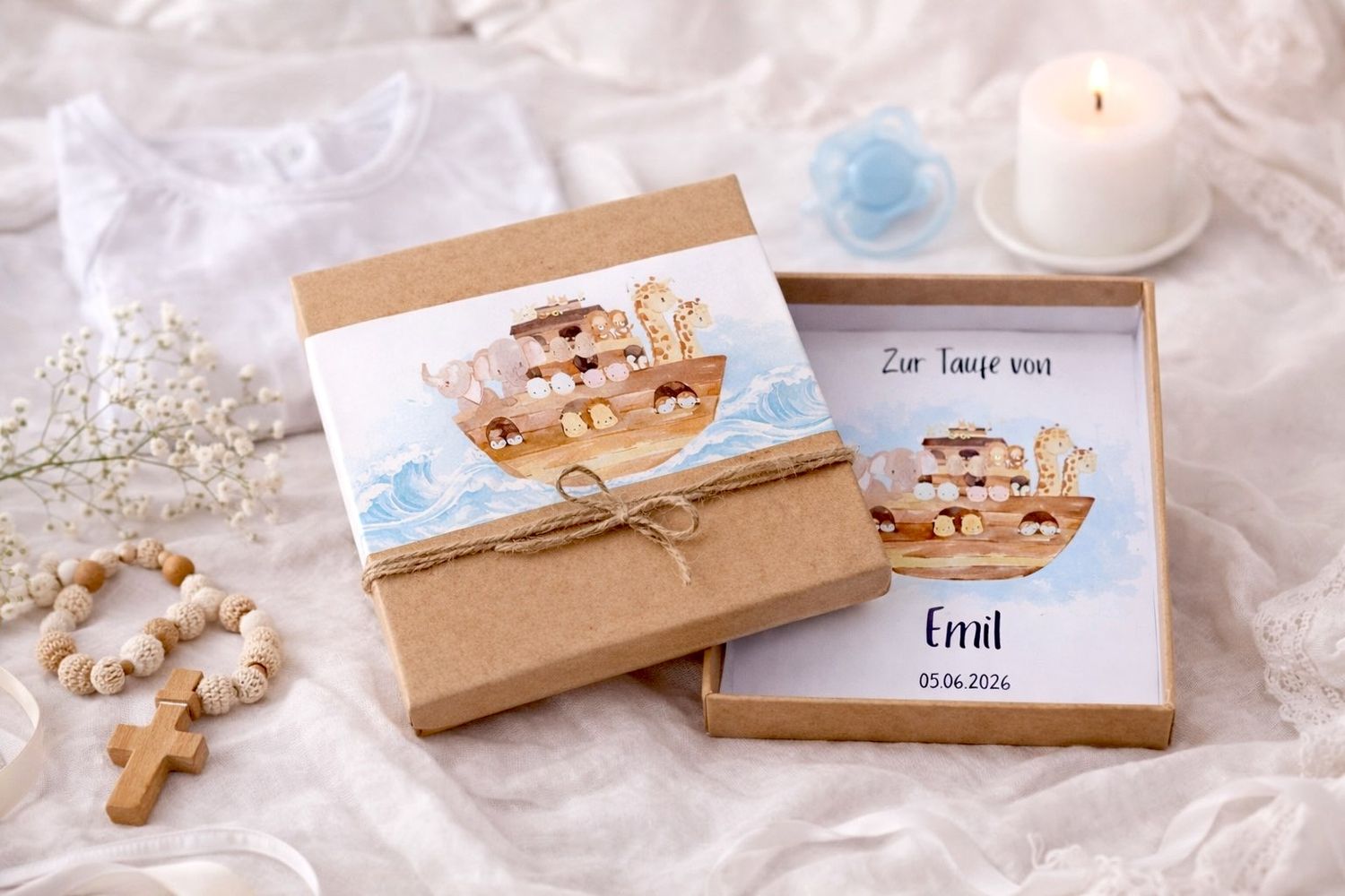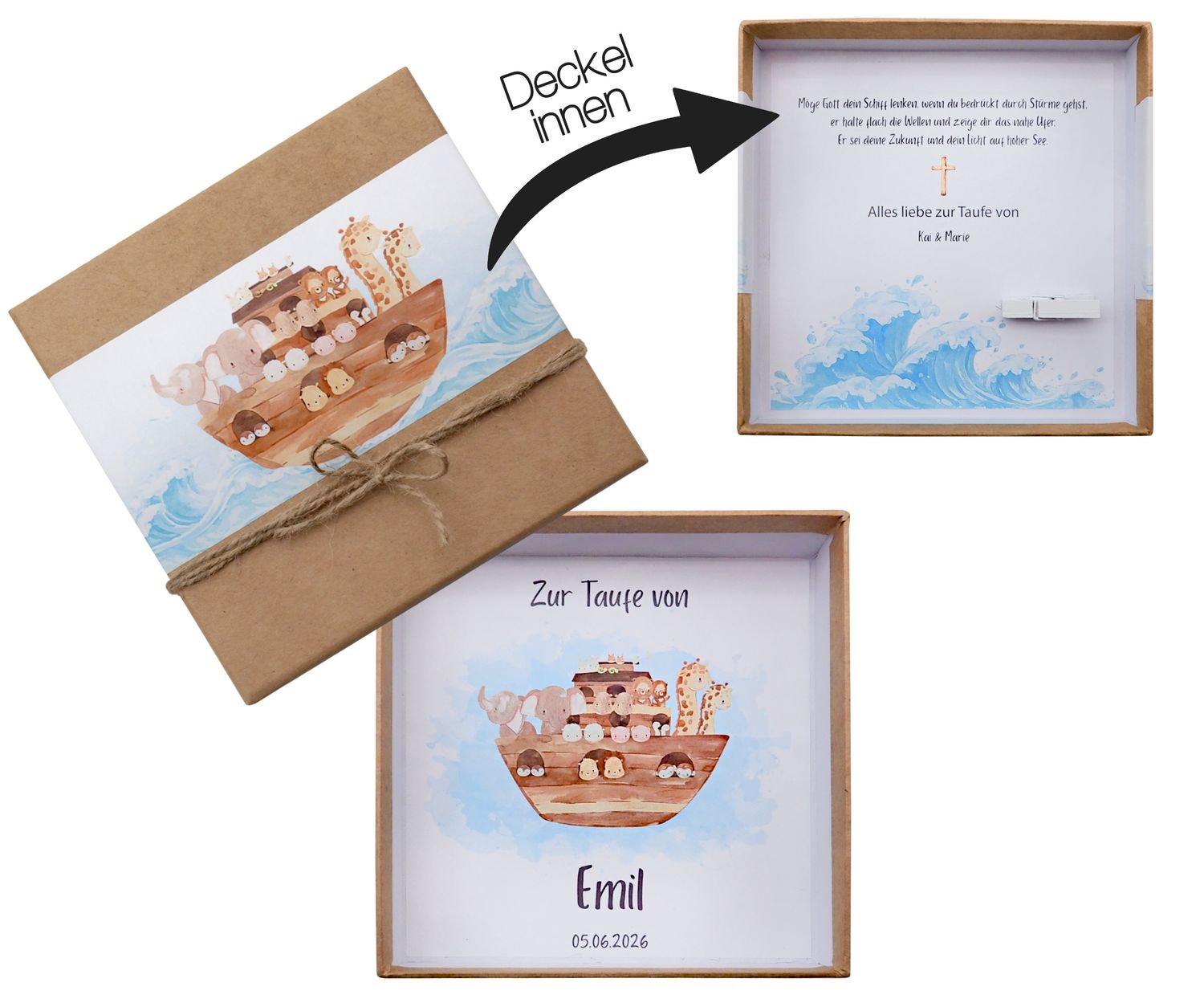 Die Geldgeschenk Verpackung ist von Innen mit dem Motiv Arche Noah, dem Anlass, Namen des Kindes, dem Datum des Festes bedrückt.