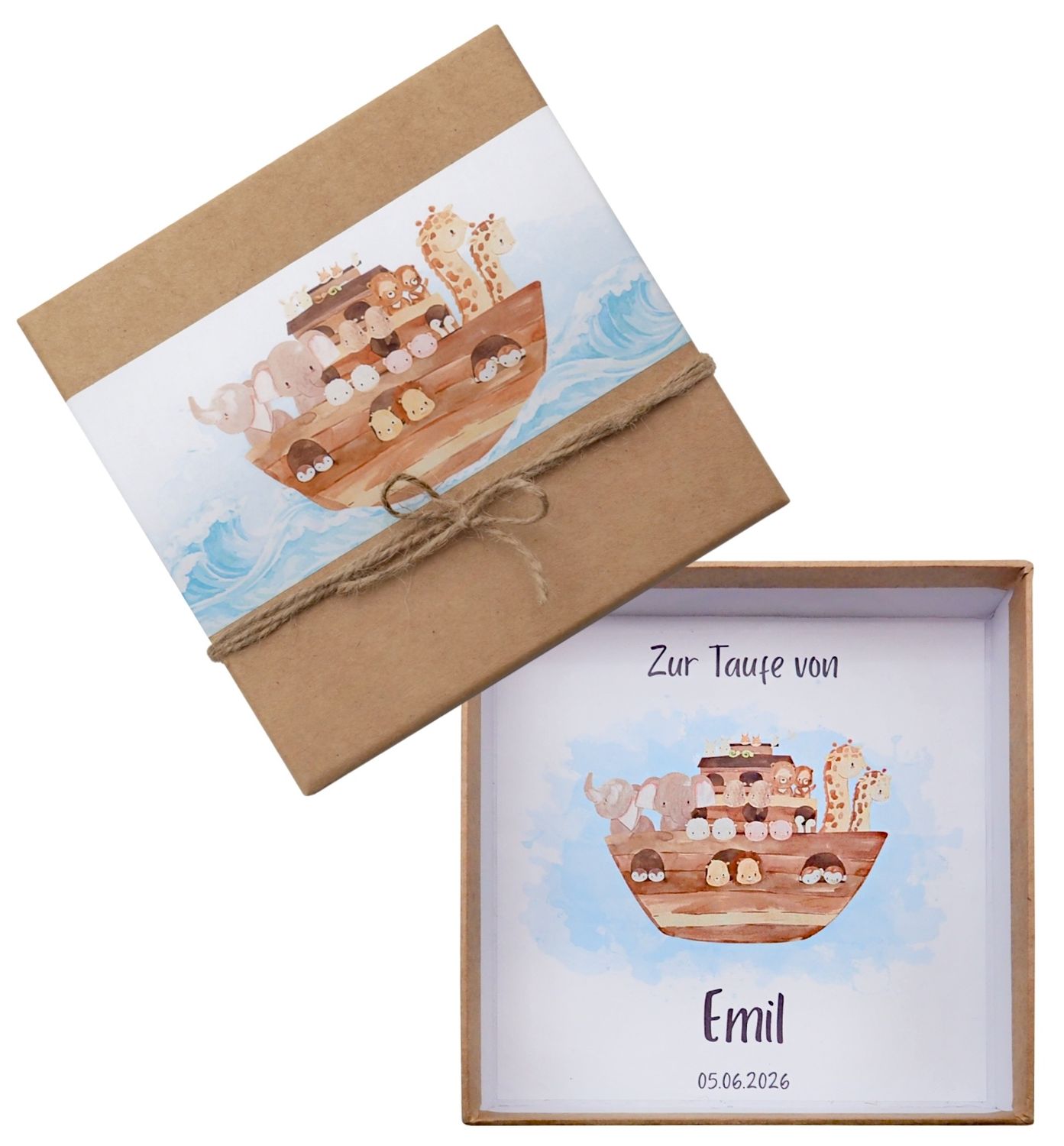 Außen ist die Box verziert mit einer Banderole bedrückt mit Motiv "Arche Noah" sowie einer Natur Kordel.