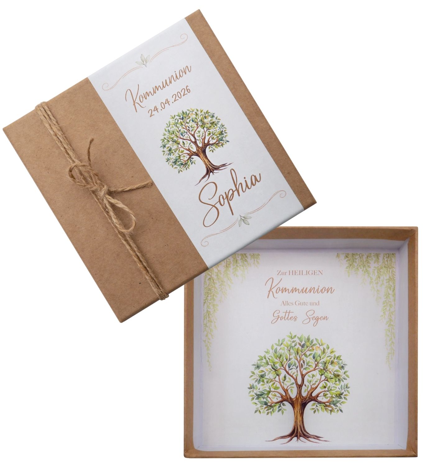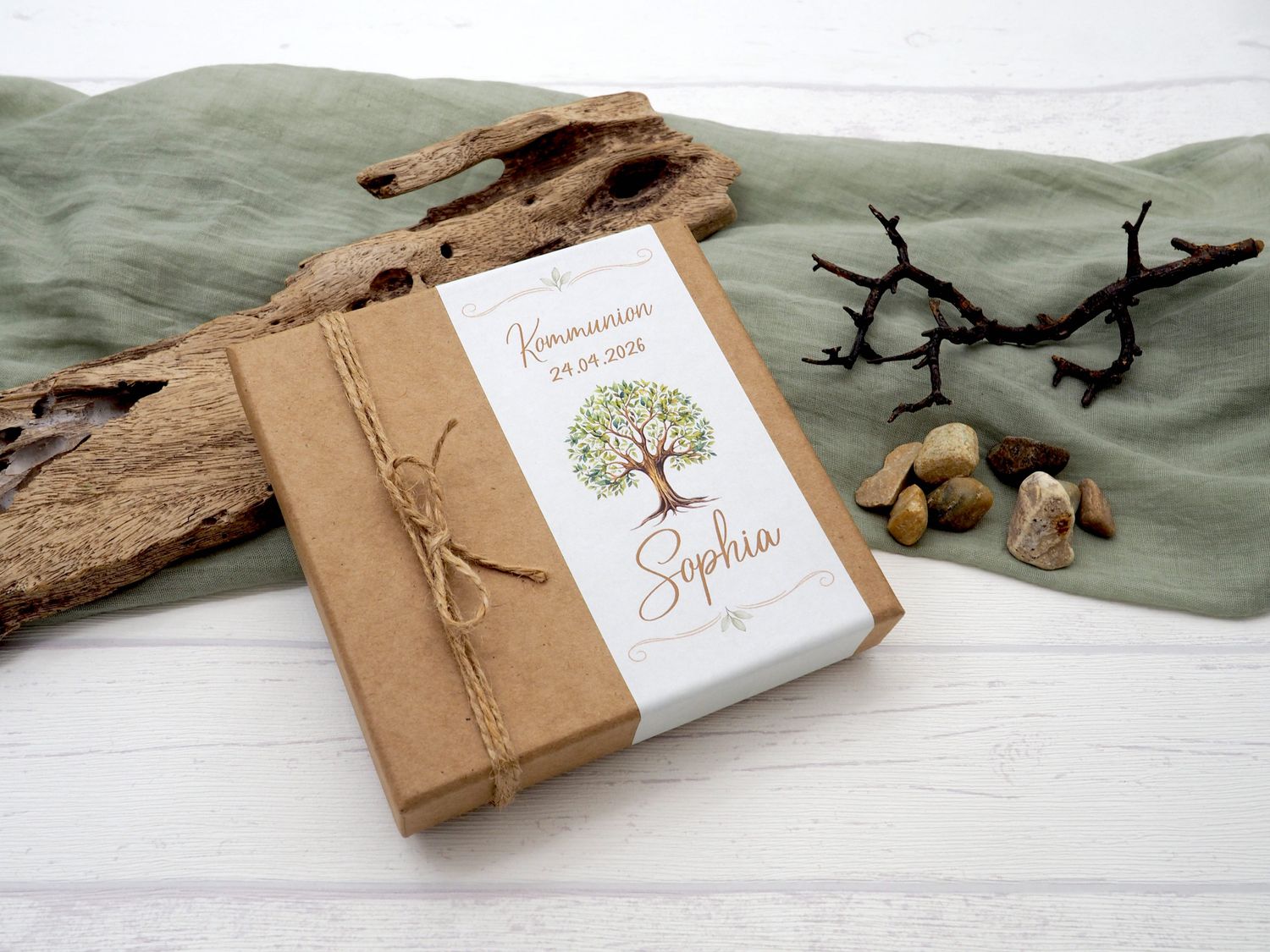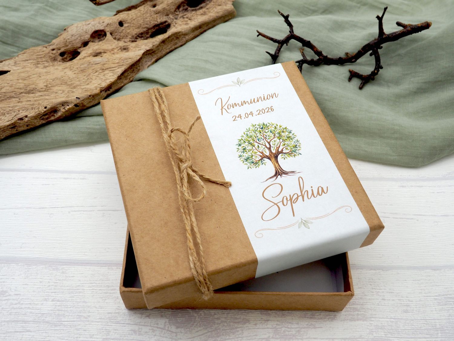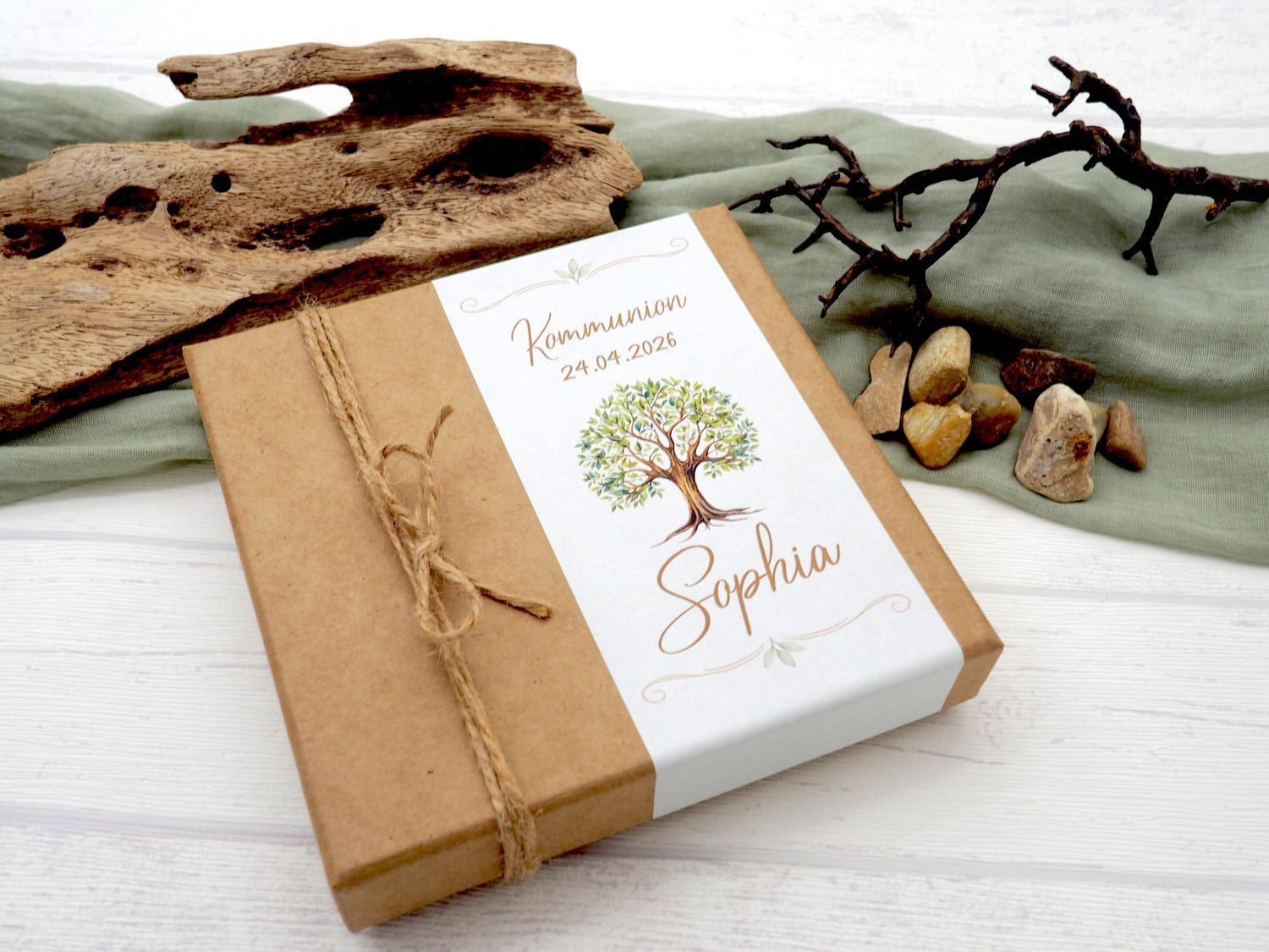 Außen ist die Box verziert mit einer Banderole bedrückt mit Motiv "Baum des Lebens", dem Anlass, Namen des Kindes, dem Datum des Festes sowie einer Natur Kordel.