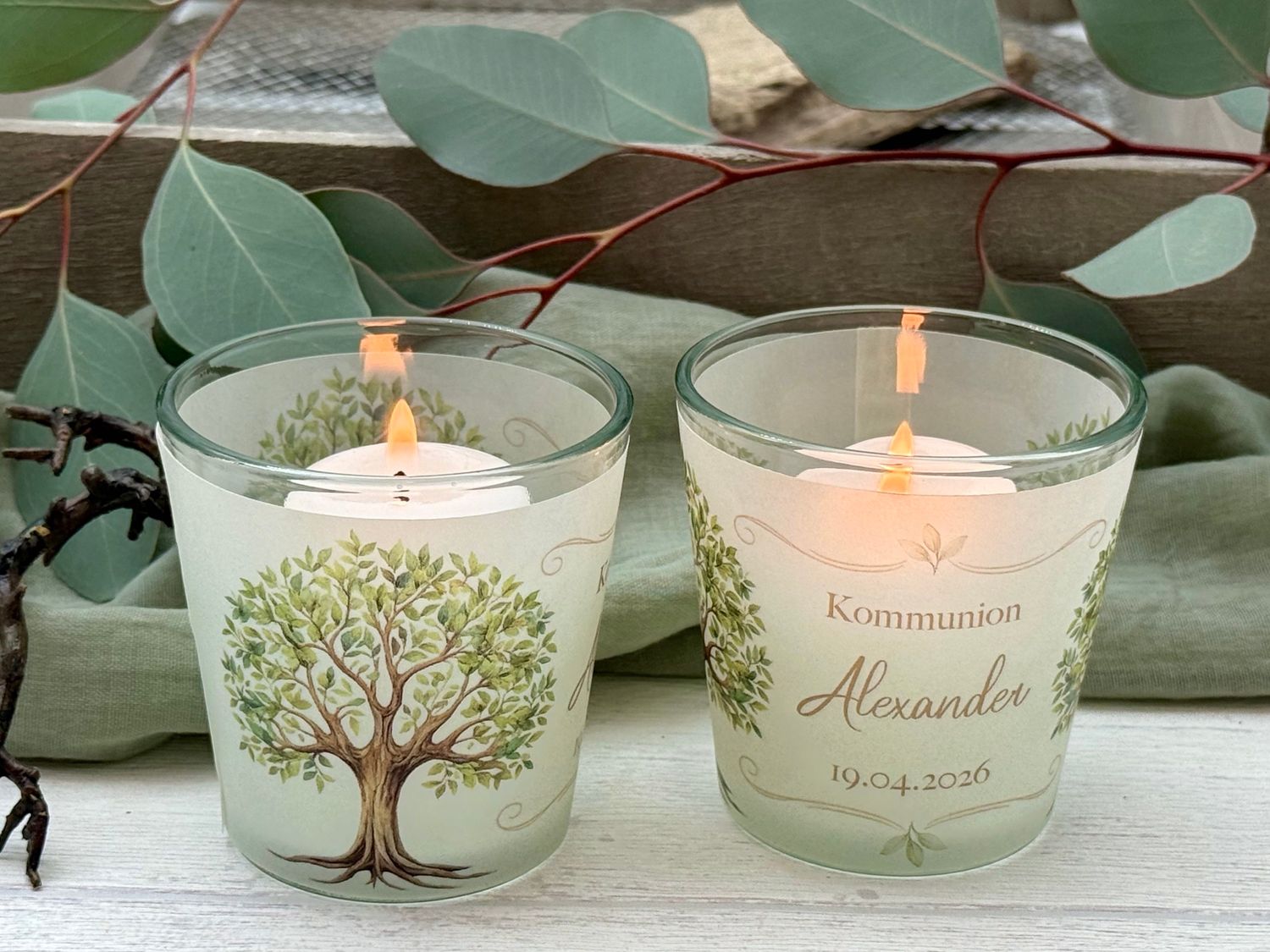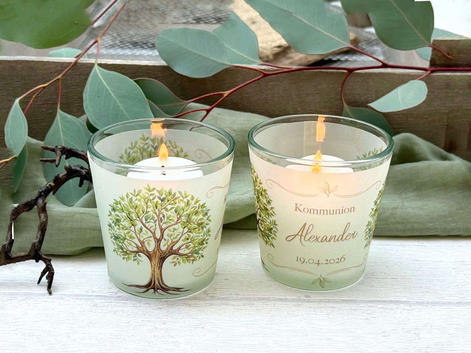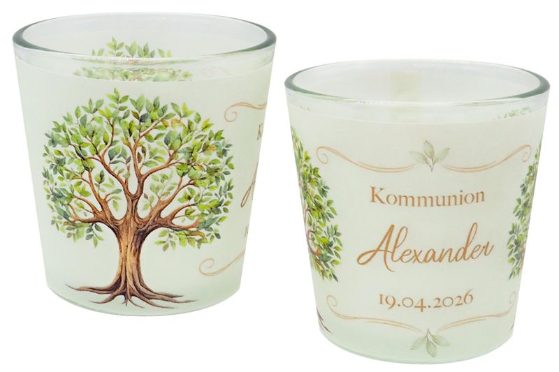 Windlichter aus Glas mit einer transparenten Banderole, die mit einem Baum des Lebens-Motiv verziert – individuell gestaltbar mit Name, Datum und Anlass