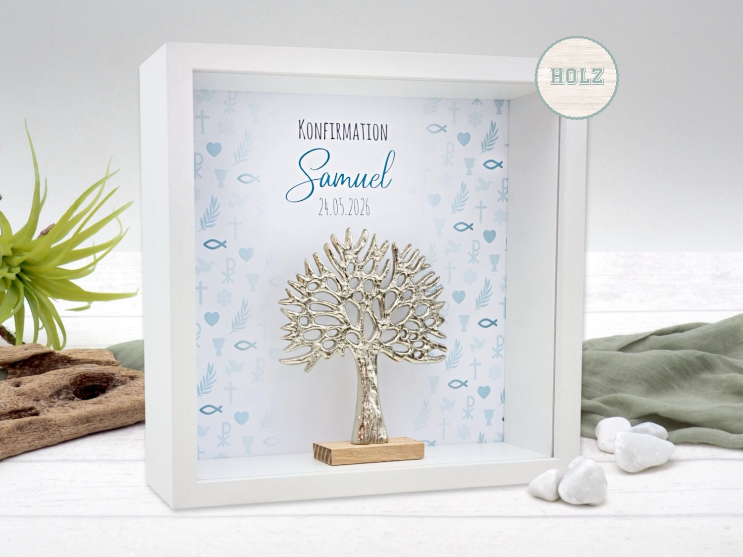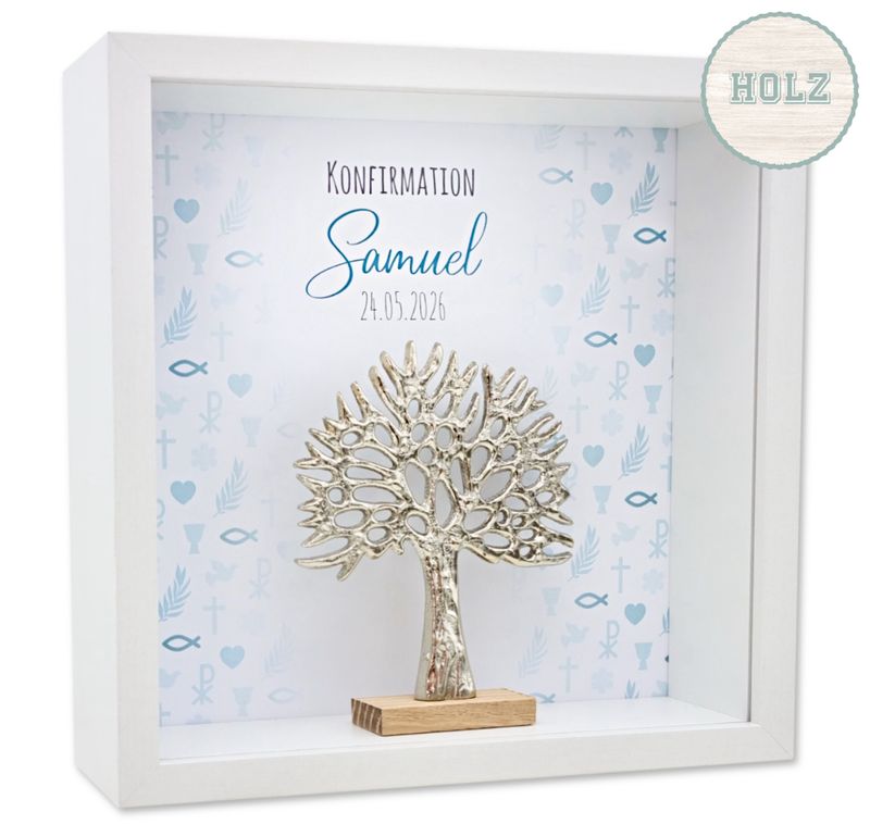 Inhalt: Ein auf Papier gedrucktes Hintergrundbild mit christlichen Motiven in Petrol Blau - personalisierbar mit Name, Anlass & Datum und eine Dekofigur "Baum des Lebens" aus Aluminium auf Holzsockel