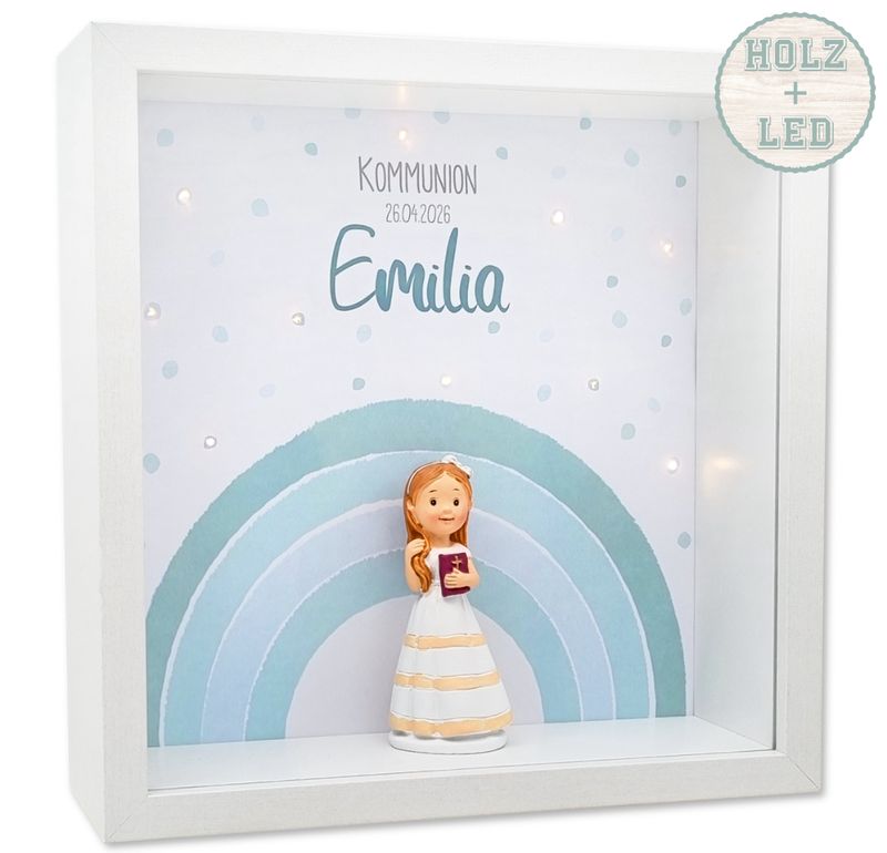 Inhalt: Ein auf Papier gedrucktes Hintergrundbild mit Regenbogen - personalisierbar mit Name, Anlass & Datum und eine Dekofigur "Mädchen im Kommunions/Konfirmationskleid".