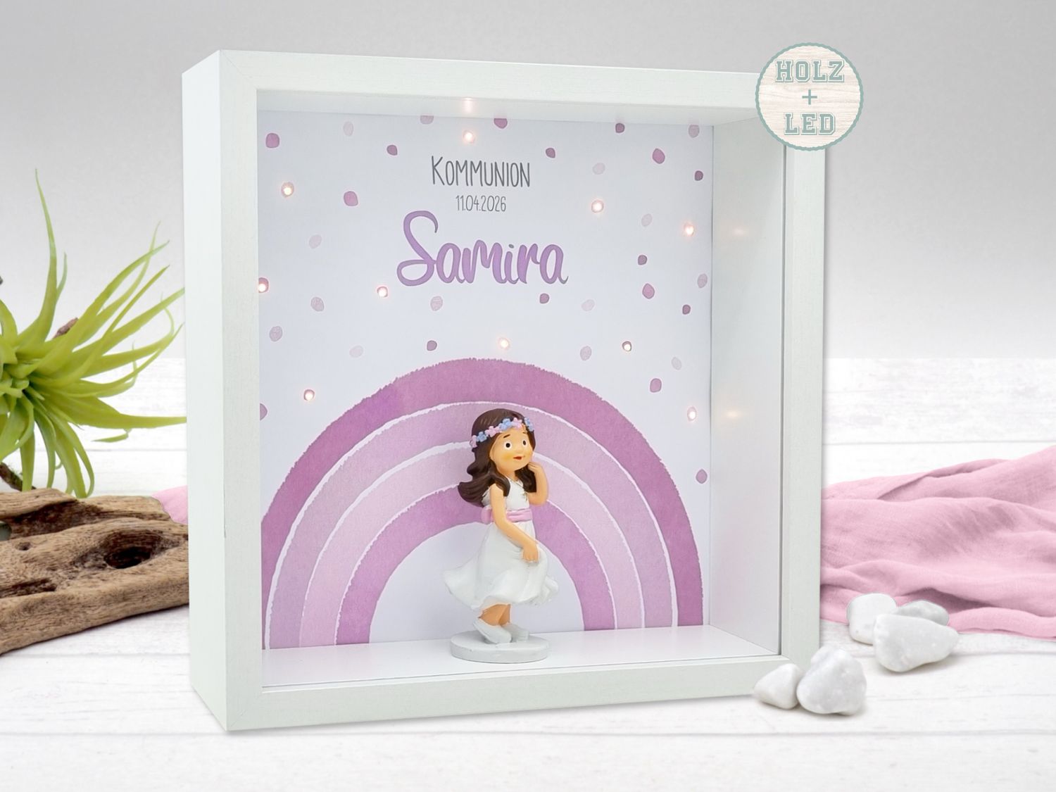 Inhalt: Ein auf Papier gedrucktes Hintergrundbild mit Regenbogen - personalisierbar mit Name, Anlass & Datum und eine Dekofigur "Mädchen im Kommunions/Konfirmationskleid".