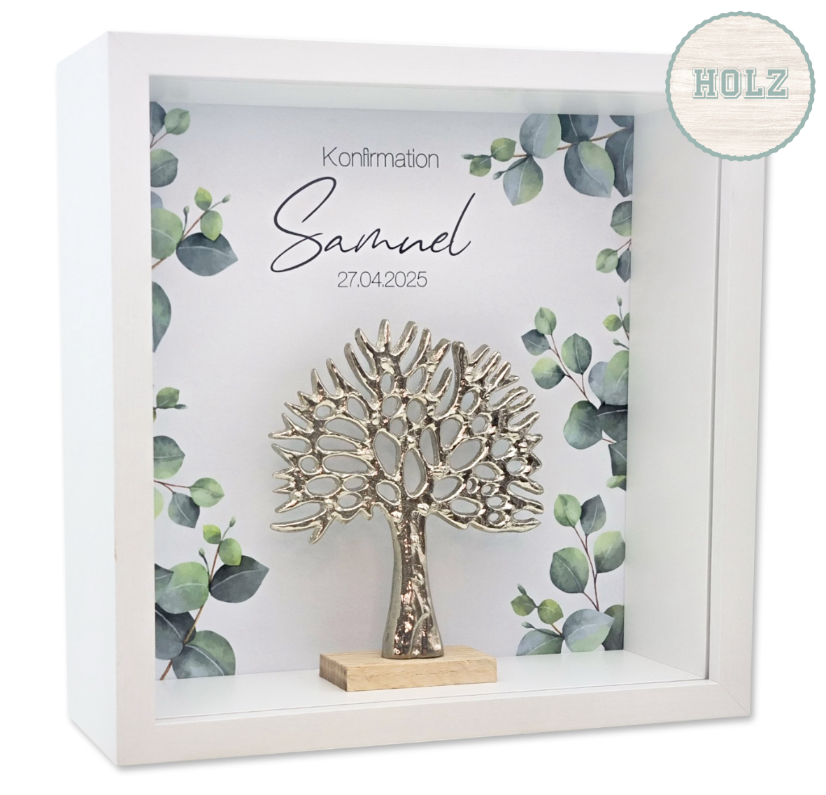 Inhalt: Ein auf Papier gedrucktes Hintergrundbild mit Eukalyptusblättern - personalisierbar mit Name, Anlass & Datum und eine Dekofigur "Baum des Lebens" aus Aluminium auf Holzsockel