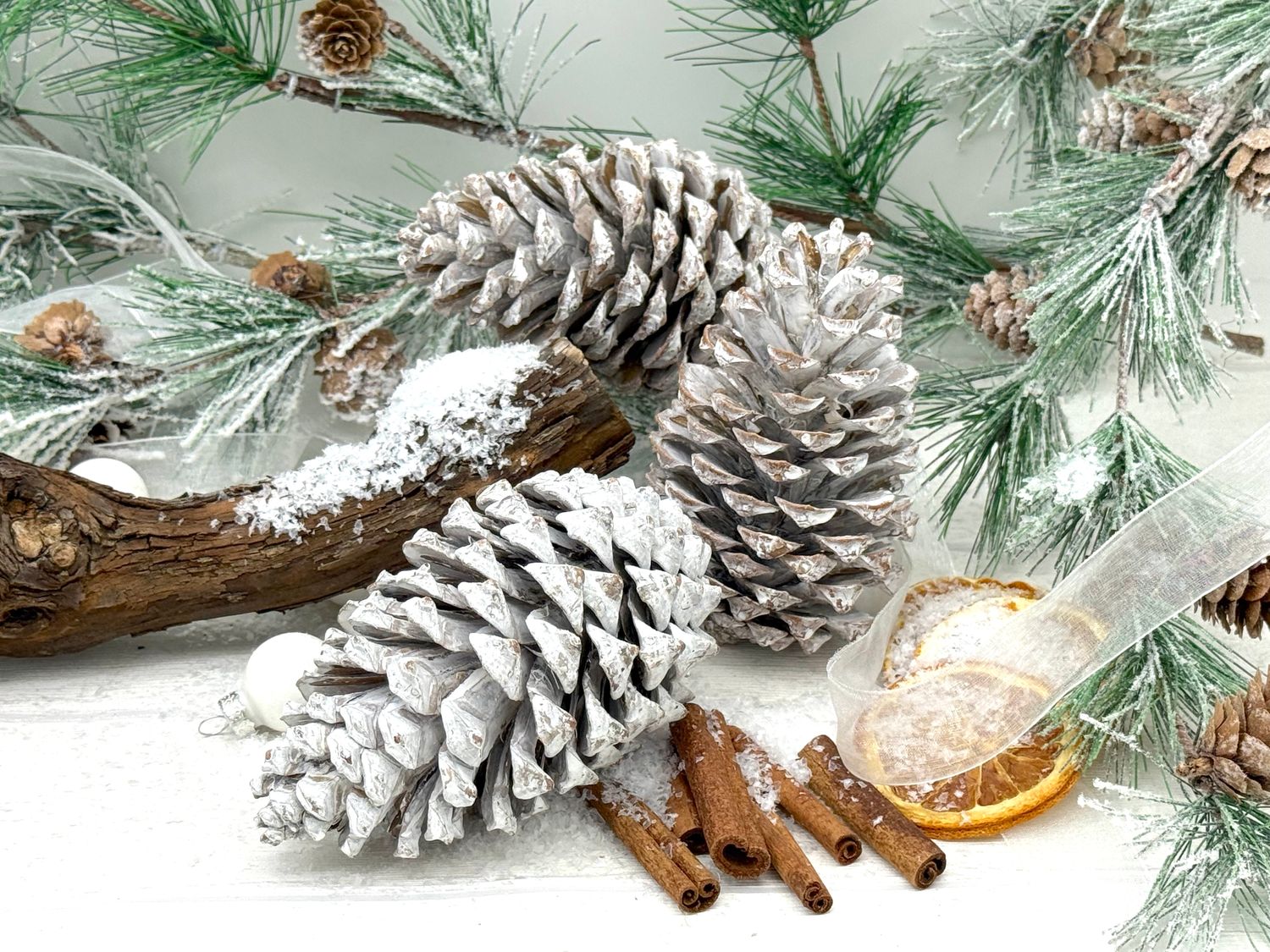 3 große Pinienzapfen in Frostoptik als Winterdeko mit rustikalem Charme