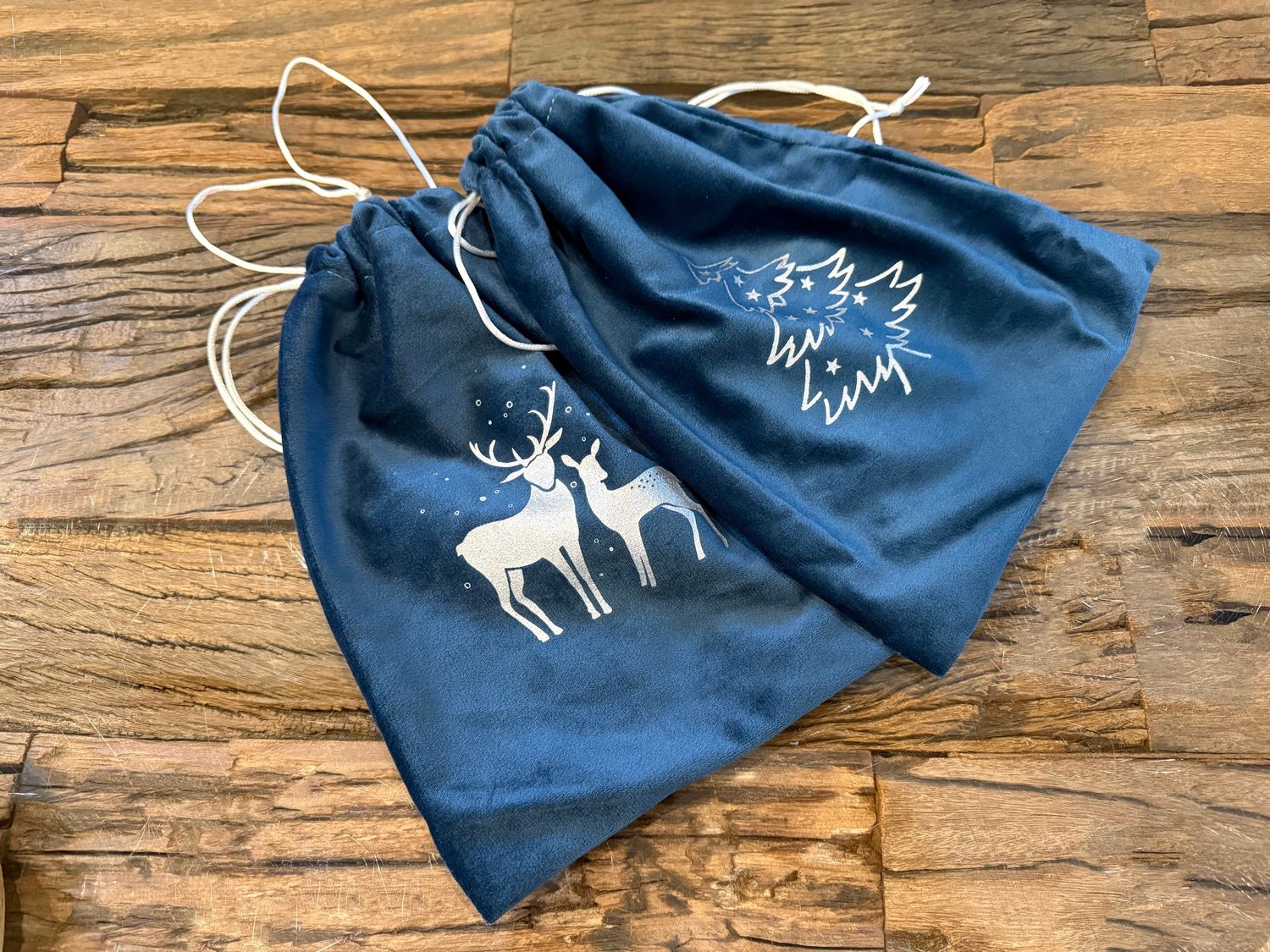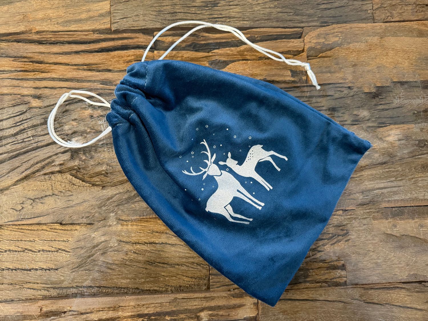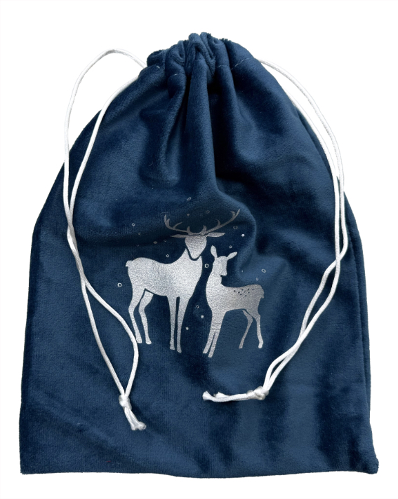 Ein Samtsäckchen mit Kordelzug und Rentieren -Silhouette in Silber bedruckt